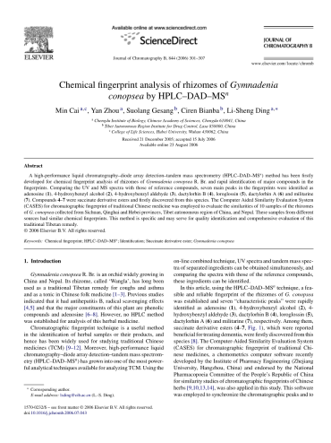 Gymnadenia conopsea R. Br。是一种在中国和尼泊尔广泛种植的兰花。它的根茎被称为“旺拉”,长期以来被用作治疗咳嗽和哮喘的传统西藏疗法,并作为中国民间医学的补品[1-3]。以前的研究表明,它具有抗乙型肝炎,清除自由基的作用[4,5],该植物的主要成分是酚类化合物和腺苷[6-8]。然而,没有建立HPLC方法来分析这种草药。色谱指纹图谱技术是鉴别草药样品或其产品的有效方法,因此被广泛用于研究中药(TCM)[9-12]。此外,高效液相色谱 - 二极管阵列检测 - 串联质谱(HPLC-DAD-MSn)已发展成为可用于分析TCM的最强大的分析技术之一。使用在线组合技术,可以同时获得分离成分的UV光谱和串联质谱,并且将光谱与参考化合物的光谱进行比较,可以鉴定这些成分。