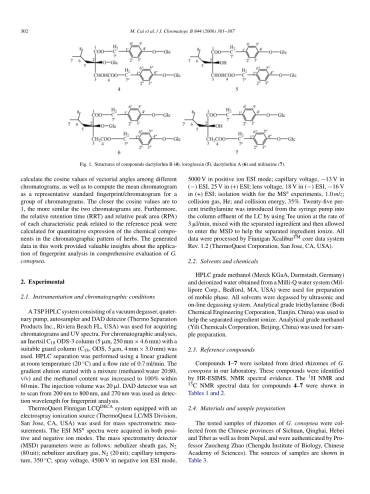 首次开发了一种高效液相色谱 - 二极管阵列检测 - 串联质谱(HPLC-DAD-MSn)方法,用于对Gymnadenia conopsea R. Br。的根茎进行化学指纹图谱分析。并快速识别指纹中的主要化合物。将紫外和质谱与参考化合物的光谱进行比较,指纹中的七个主峰被鉴定为腺苷(1),4-羟基苄醇(2),4-羟基苄基醛(3),二酰基乙酰基B(4),loroglossin( 5),dactylorhin A(6)和militarine(7)。化合物4-7是琥珀酸衍生物酯,并且首先从该物种中发现。采用中药色谱指纹图谱计算机辅助相似性评价系统(CASES) 评价10种根茎样品的相似性从四川,青海和河北省,西藏自治区和尼泊尔收集的G. conopsea。来自不同来源的这些样品具有相似的化学指纹。这种方法具体,可以用于这种传统西藏疗法的质量鉴定和综合评估。