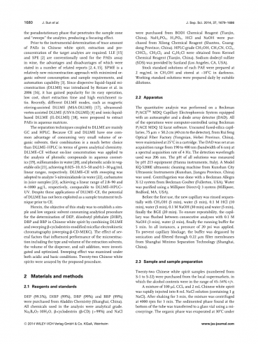 从当地超市购买了22个中国白酒样品(编号为S-1至S-22),其中酒精含量在45-54%v / v的范围内。将100mu;LCCl4 和2mL中国白酒的混合物快速注入8mL NaCl溶液(含有1g NaCl)中。摇动3分钟后,将混合物以4000rpm离心3分钟。使用微量注射器将在管底部发现的沉淀相转移到玻璃小瓶中。将有机相在30℃下蒸发