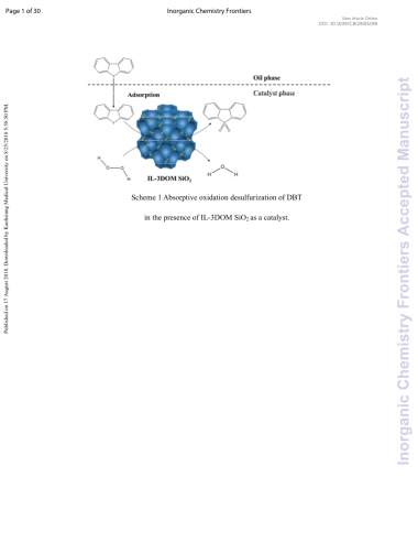 开发高效的燃料脱硫催化剂,减少硫氧化物污染至关重要。在本研究中,成功制备了基于多金属氧酸盐的离子液体三维有序大孔二氧化硅(IL-3DOM SiO2),用于芳烃硫化合物的非均相氧化脱硫。使用FTIR,XRD,XPS,SEM,TEM和BET分析表征所制备的材料,显示出大孔径和高比表面积。具有3DOM结构的杂化材料在温和条件下对芳族硫化合物表现出优异的脱硫性能。此外,在17个循环后没有观察到活性的明显降低,表明杂化材料具有良好的稳定性。所制备的IL-3DOM SiO2 是未来脱硫行业应用的理想选择。