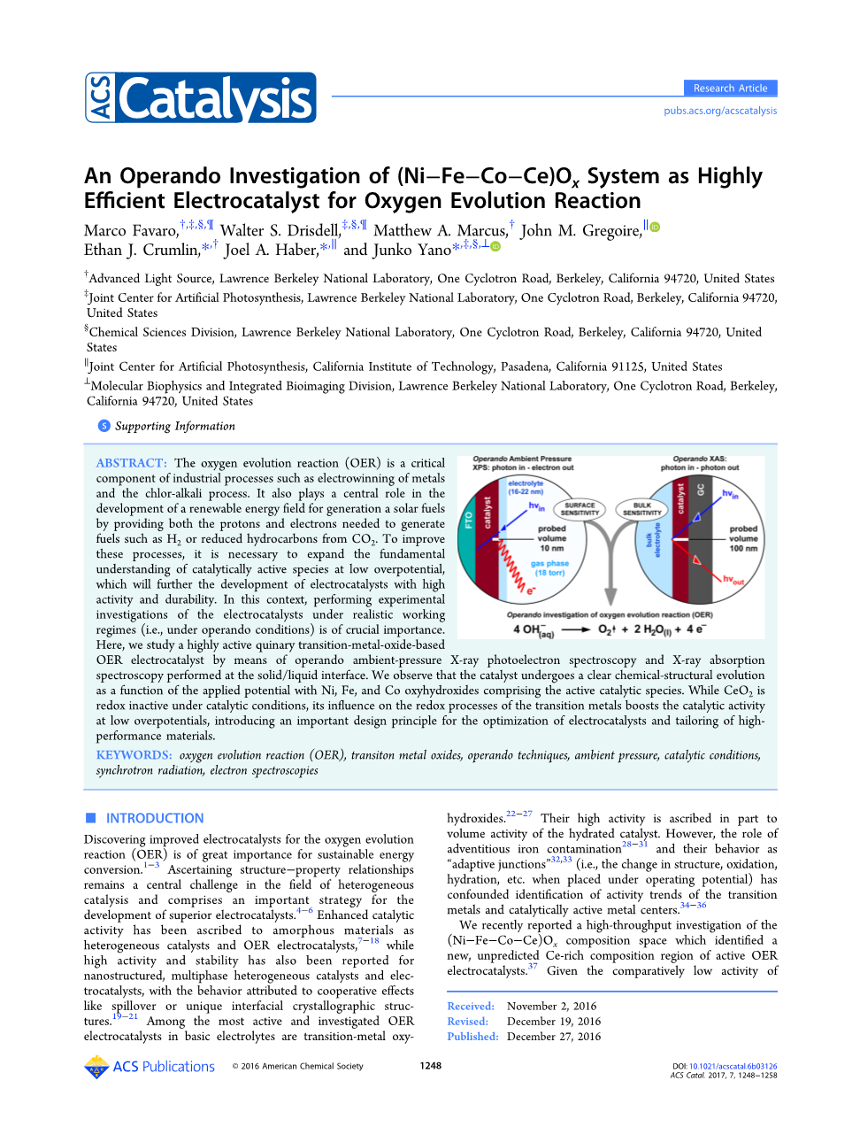发现改进的电催化剂用于氧气析出反应(OER)对于可持续能量转换具有重要意义1-3。确定结构-性质关系仍然是非均相催化领域的核心挑战,并且是开发优质电催化剂的重要策略。 4-6增强的催化活性已经归因于非晶态材料作为非均相催化剂和OER电催化剂,7-18而纳米结构,多相催化剂和电催化剂也有高活性和稳定性的报道,将其行为归因于协同作用溢出或独特的界面结晶结构.19-21在碱性电解质中最活跃和最受研究的OER电催化剂是过渡金属氢氧化物22-27。它们的高活性部分归因于水合催化剂的体积活性。然而,外来铁污染28-31及其作为“适应性连接”32,33(即结构变化,氧化,水合等处于工作电位下的行为)的作用混淆了过渡金属和催化活性金属中心活动趋势.34-36我们最近报道了一个高通量的(Ni-Fe-Co-Ce)Ox组分空间的研究,该空间确定了一个新的,未预测到的富Ce组分区域的活性OER电催化剂.37考虑到CeOx活性相对较低,富含铈催化剂的活性是相当惊人的,这激发了对该催化剂的详细研究。 先前用XAS和低剂量,高分辨率TEM对Ni0.3Fe0.07Co0.2Ce0.43Ox催化剂的非原位结构表征表明该催化剂是两相纳米复合材料,其中CeO2纳米颗粒形成具有合金化转变的原子尖锐晶界 金属氧化物38。虽然对合成后催化剂和术后催化剂的检查显示结构或化学性质没有明显变化,但了解纳米结构所能实现的催化活性需要在极化下进行详细的表征(即,作为所应用潜力的作用),这是在这里报告。