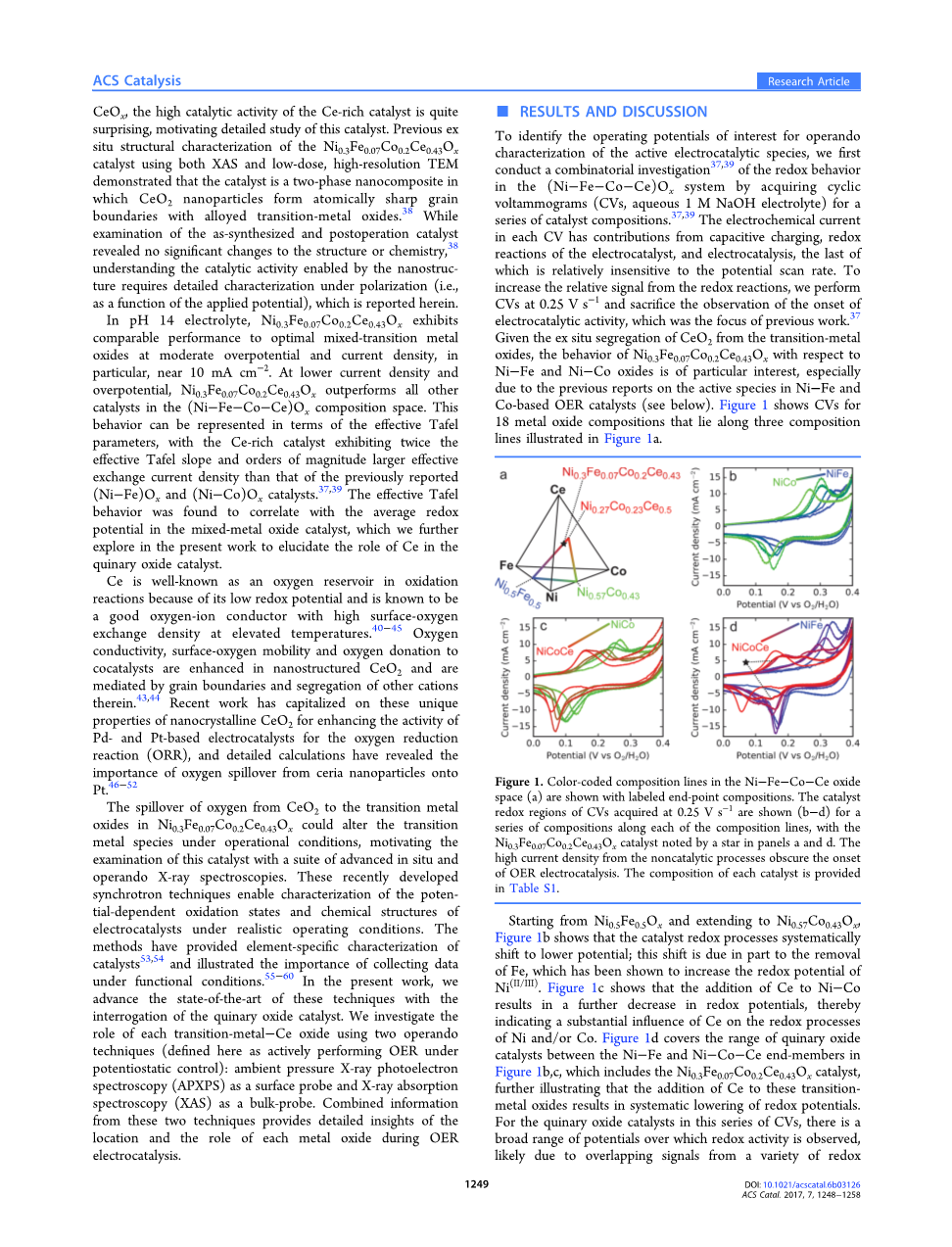 为了确定活性电催化物种的操作性表征的有利的操作电位,我们首先通过获取循环伏安图(CVs,1水溶液),在(Ni-Fe-Co-Ce)Ox系统中进行氧化还原行为的组合研究37,39 M NaOH电解质)用于一系列催化剂组合物37,39。每个CV中的电化学电流具有电容充电,电催化剂的氧化还原反应和电催化的作用,其中最后一种对电位扫描速率相对不敏感。为了增加氧化还原反应的相对信号,我们以0.25 V s-1进行CV,并牺牲电催化活性开始的观察,这是以前工作的重点.37考虑到CeO2从过渡金属氧化物中非原位分离,Ni0.3Fe0.07Co0.2Ce0.43Ox相对于Ni-Fe和Ni-Co氧化物的行为特别重要,特别是由于先前关于Ni-Fe和Co基OER中活性物质的报道催化剂(见下文)。图1显示了18种金属氧化物组合物的CV,其沿图1a中所示的三条组成线排列。