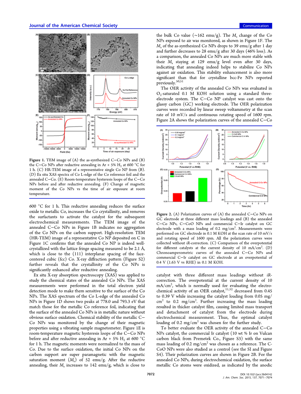 退火的C-Co NPs和商业C-Ir NPs的稳定性通过使用计时电流法在0.4V的超电势下测试(图2D)。 1小时后,退火C-Co纳米颗粒的电流密度下降13%,而C-Ir纳米颗粒的电流密度下降45%。即使经过6小时的测试,C-Co NPs的活性下降速度仍比商用C-Ir慢,这表明退火后的Co NPs比商业Ir NPs稳定得多。在稳定性测试之后,催化剂中的NP进一步表征(图S6)。 Ir纳米颗粒是聚集的,而Co纳米颗粒很好地分散在碳载体上,但由于Co的表面氧化而具有核/壳结构,这解释了它们随着时间的推移缓慢的活性下降。我们应该注意到,通过上述相同的还原退火,氧化的Co可以容易地还原成Co,并且C-Co催化剂可以再生并重新用于OER。