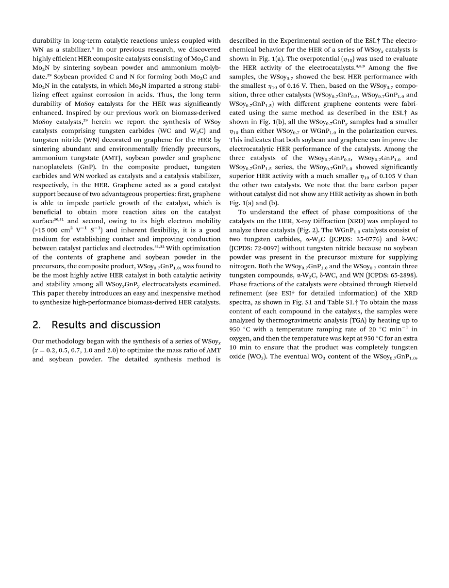 另一方面,尽管含有很少的WN,WSoy0.7GnP1.0中WC的含量也比WGnP1.0少(如表1所示),WSoy0.7GnP1.0对析氢反应的催化性能也比WGnP1.0要高(如图1所示)。我们注意到WGnP1.0不含WN。如图1b所示,在之前的研究中发现单独的WN对析氢反应只有微弱的催化效力。因此,本研究的结果表明,除了作为稳定剂,WN可能会产生协同效应,就算含量很少也能增强碳化钨的催化效力。氮化物和碳化物之间可能存在电子耦合,其中的机理尚未解释但是怎在进行。