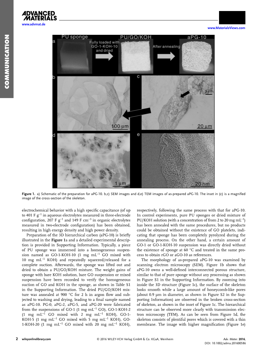正如我们所看到的,作为一种具有成本效益的模板,海绵能够作为超级电容器电极碳纳米结构组装的极好支持。然而,海绵模板石墨烯结构受到相对较低的比表面积(SSA)(例如STGS:305 m2 g-1)的限制,进而限制了超级电容器性能的进一步改善。另一方面,大多数具有高比表面积的石墨烯基组件具有较低的电极密度(通常小于0.5 g cm-3),这导致电极中的大量空隙将会被电解质淹没,从而降低了最终器件的电性能[15]。李和同事们展示了化学制备的石墨烯水凝胶薄膜,其堆积密度高达1.33 g cm-3,具有突出的电容性能(在有机电解质中为209 F g-1和261 F cm-3)[16]。石墨烯片层的层状堆叠可能会由于在垂直于层的方向上的离子通道不足而导致功率输出恶化。