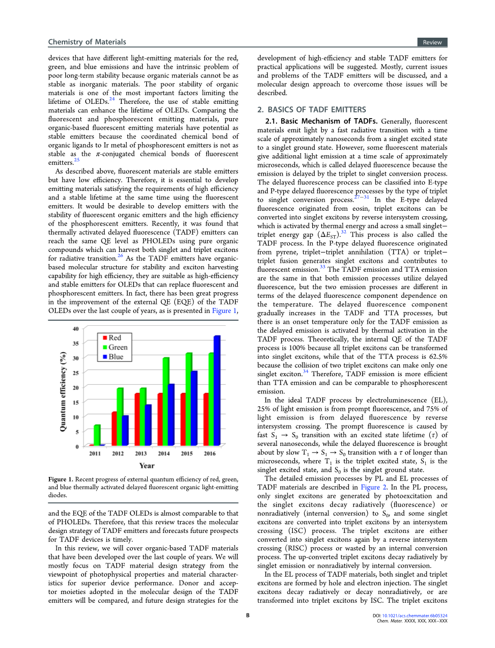 总的说来,荧光材料发光是因为单重态激子在纳秒级时间内经过辐射跃迁回到基态形成的。但有一些材料拥有更长的发光时间,可以达到微秒级,称之为延迟荧光,产生这种现象的原因是由于三重态激子到单重态激子的转变。根据三重态到单重态的转变方式不同可将延迟荧光过程分为电激活延迟荧光和热激活延迟荧光。电激活延迟荧光来源于薯红,三重态激子吸收热能通过反向系间窜越跳过三重态与单重态的能极差转变为单重态。这个过程也叫做延迟荧光过程。光激活延迟荧光开始于嵌二萘,通过三重态-三重态湮灭或三重态-三重态融合产生单重态激子并促使荧光发射。TADF发射和TTA发射相同,利用延迟荧光发射过程,但这两个发射过程是不同的,延迟荧光主要为组件对温度的依赖。延迟荧光组件在TADF和TTA过程逐渐增加,但有一个温度即只有TADF发射的推迟发射是由热激活的激活TADF过程。从理论上讲,内部TADF的内量子效率是100%,因为所有的三线态激子可以转换单线态激子,而TTA的过程是62.5%因为两个三线态激子的碰撞可以只有一个单线态激子。因此,TADF比TTA发射量子效率更高,可以与磷光发射媲美。