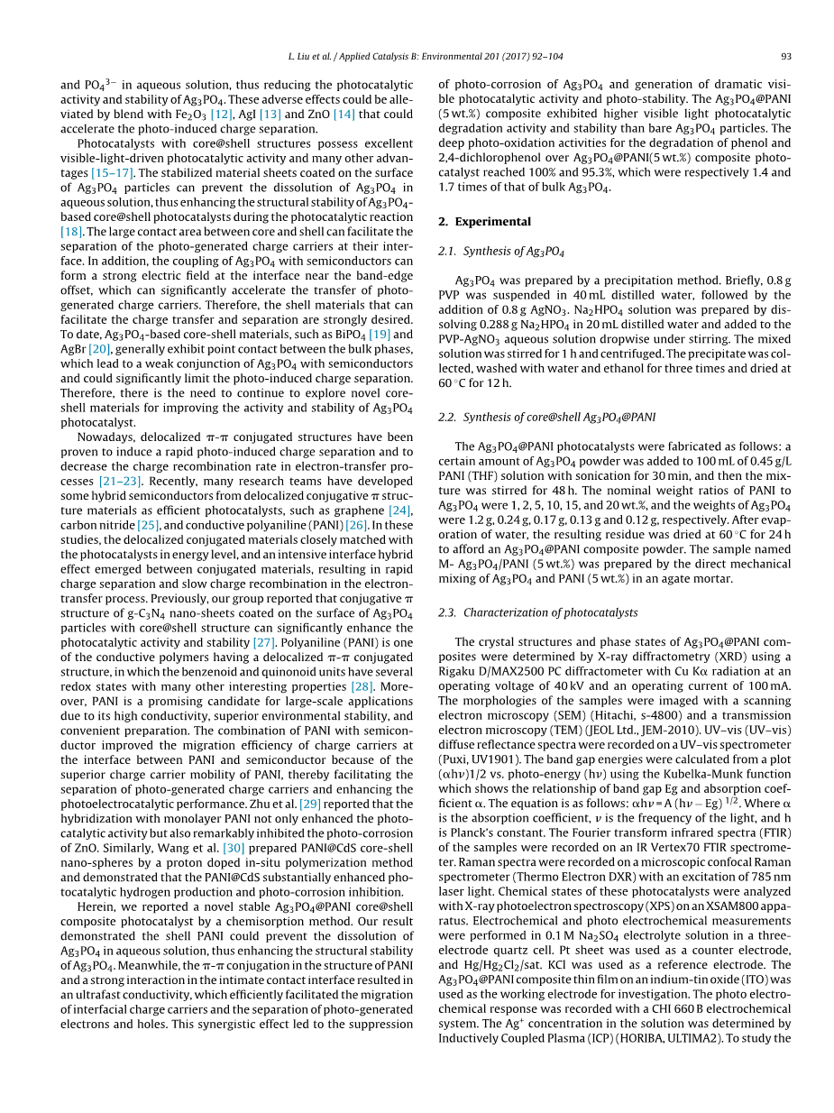 Ag3PO4@PANI的核壳稳定体:利用pi;-pi;共轭增强光催化降解性能
