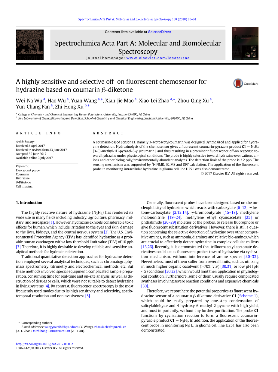 因此,我们在此论述香豆素beta;-二酮衍生物C1的荧光肼传感器(Scheme 1)的潜在性质,其可通过水杨醛和4-羟基-6-甲基-2-吡喃酮的一步缩合容易地制备产量高,最重要的是,不需要进一步纯化。探针C1通过环化反应起作用以形成荧光香豆素吡唑产物C1-N2H4。此外,荧光探针在神经胶质瘤细胞系U251中监测N2H4的应用也已被证明。