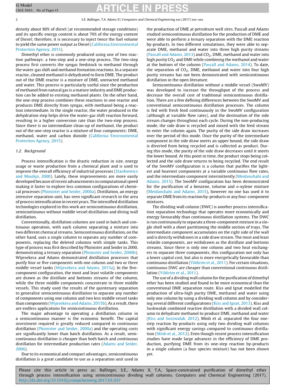 由于其经济和紧凑的优点,半连续蒸馏被看作在石油井位置生产DME的分离单元的绝佳候选物。 Pascall和Adams研究了用于生产DME的半连续蒸馏,并且能够用DME反应副产物进行三元分离。 在两种不同的模拟中,他们能够将DME,甲醇和水分离成三个高纯度流(Pascall和Adams,2013)和二氧化碳,同时将甲醇和水列在底部(Pascall和Adams,2014)。 迄今为止,在公开的文献中,通过半连续蒸馏,没有证明将二氧化碳,DME,甲醇和水分离成四个高纯度物流。