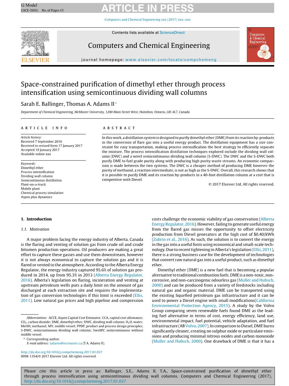 在这项工作中,设计了一种蒸馏系统,用于在将火炬气转化成有用能量产物时从其反应副产物中纯化二甲醚dimethyl ether(DME)。 蒸馏设备具有尺寸限制,为了便于运输,而使过程集约化成为有效分离混合物的最佳策略。 被探索的过程集约化蒸馏技术包括分隔壁柱dividing wall column( DWC)和新型半连续分隔壁柱novel semicontinuous dividing wall column(S-DWC)。 DWC和S-DWC都将DME净化为燃料级纯度,同时产生高纯度废物流。 两个系统之间的经济比较为DWC是生产DME的更便宜的方法,然而甲醇的纯度(反应中间体)不如S-DWC那么高。 总体而言,这项研究表明,以一个与柴油价格相差不大的价格在一个40英尺的蒸馏塔中去纯化DME和它的反应副产品是有可能的。