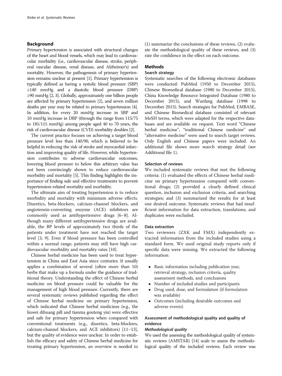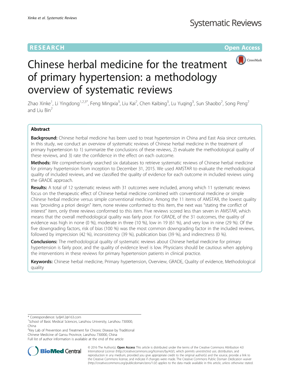 几个世纪以来,中草药一直用于治疗中国和东亚的高血压。它通常在传统理论的指导下应用几种(通常超过10种)草药的组合。了解中草药对血压的影响对于高血压的治疗可能是有价值的。目前关于中药对原发性高血压疗效的系统评价有多篇,表明与传统治疗相比,中草药(如六味地黄丸,天麻钩藤饮)对原发性高血压有效且安全例如利尿剂,beta;-受体阻滞剂,钙通道阻滞剂和ACE抑制剂)[11-13],但证据质量尚不清楚。为了确定中草药治疗原发性高血压的有效性和安全性,需要概述(1)总结这些评论的结论,(2)评估这些评论的方法学质量,以及(3)评估信心对每个结果都有影响。