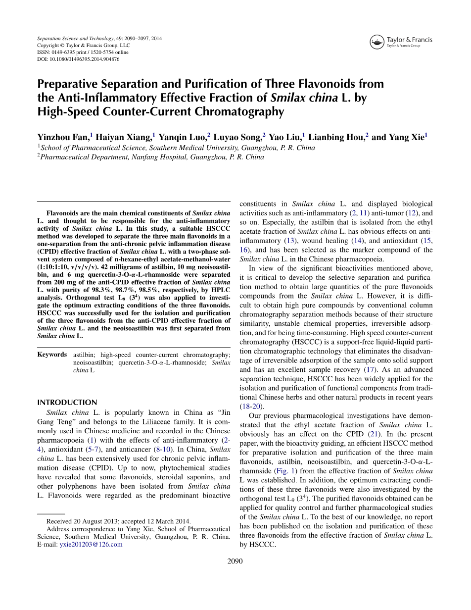 高速逆流色谱制备分离纯化来自中药菝葜的抗炎有效组分三种黄酮类化合物