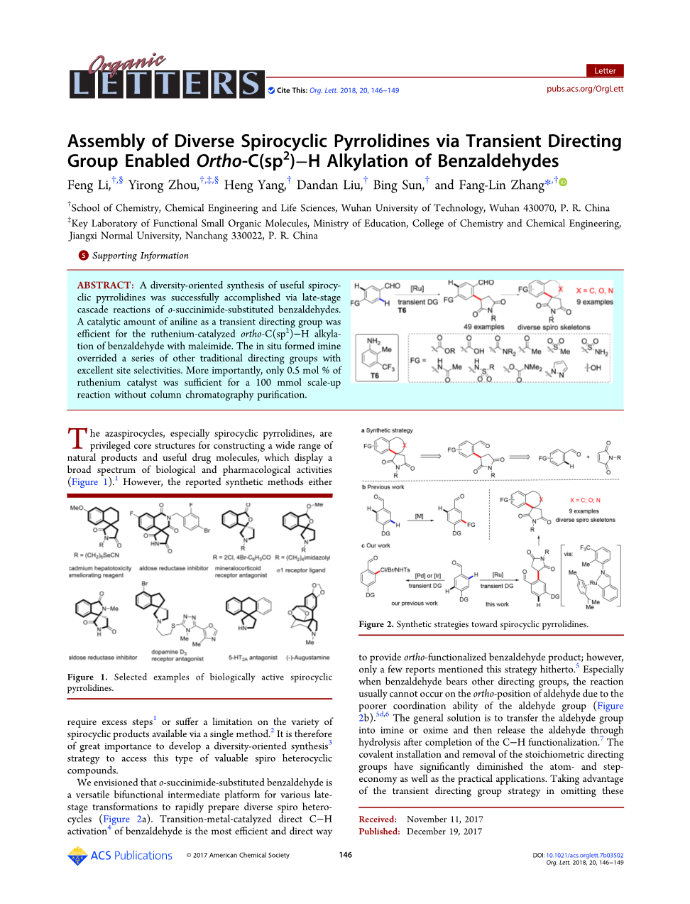 缺点,8 余老师的小组和我们报导了使用瞬时引导基团的多种钯(或铱) - 催化的邻位C(sp2) - H官能化的苯甲醛,所述瞬时引导基团过度存在于苯甲醛内的各种其他配位官能团(图2c).9 另外,我们的团队主要关注通过级联反应合成杂环。10 在这里,我们报告了第一个瞬态指导组启用钌催化的ortho-C(sp2) - H烷基化苯甲醛马来酰亚胺11 和随后的多样化新型螺环吡咯烷的多样化导向合成(图2c).