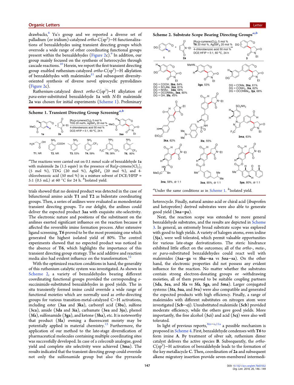 提供邻位官能化的苯甲醛产物; 然而,迄今为止,只有少数报告提到这一策略。5 特别是当苯甲醛带有其他引导基团时,由于醛基的配位能力较差,通常不会在醛的邻位发生反应(数字 2b).5d,6 通常的解决方案是将醛基转化为亚胺或肟,然后在完成C-H官能化后通过水解释放醛。7 化学计量导向基团的共价安装和移除显着地减少了原子和步骤经济以及实际应用。 利用暂时指导组策略省略这些