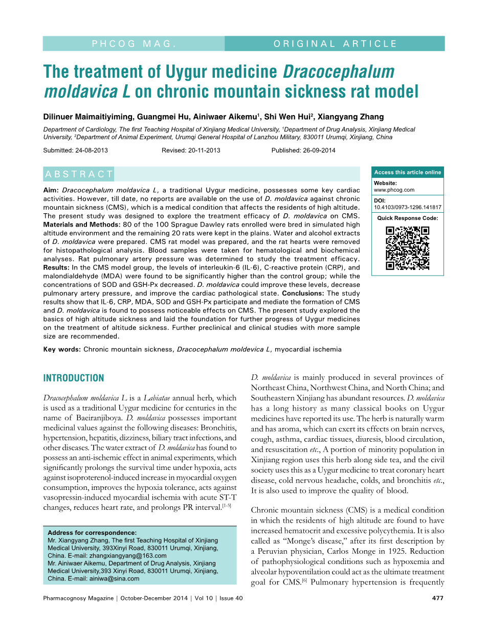 目的:传统维吾尔医药香青兰具有一些关键的心脏活动。然而,至今为止,还没有关于使用香青兰治疗慢性高山病(CMS)的报道,是一种影响高海拔居民的医疗状况。本研究旨在探讨香青兰对CMS的治疗效果。
