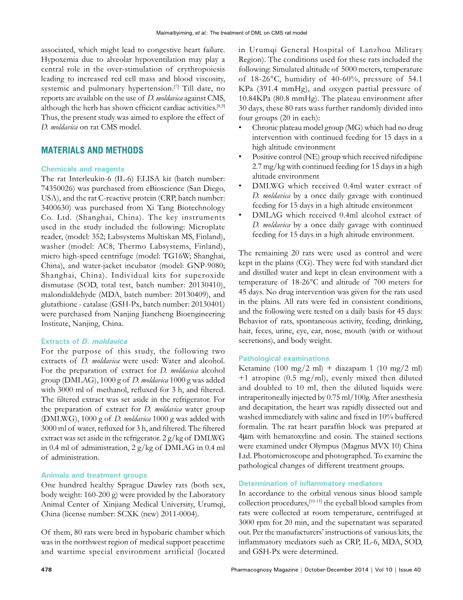 材料和方法:入选的100只斯普拉格道利斯大鼠中的80只在模拟的高海拔环境中饲养,其余20只大鼠保存在平原中。准备了香青兰的水和乙醇提取物。制备CMS大鼠模型,取出大鼠心脏进行组织病理学分析。采集血液样本进行血液学和生化分析,测定大鼠肺动脉压力以研究治疗效力。
