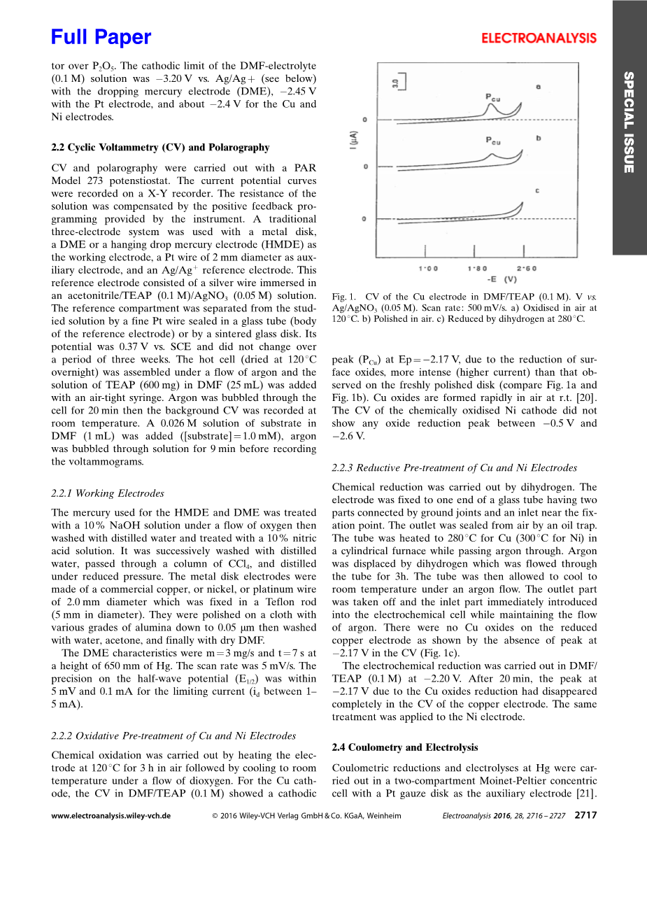 化学氧化通过加热电子在120℃下在空气中放置3小时,然后冷却至室温在分子氧气流下的温度。 对于Cu阴极在DMF / TEAP(0.1M)中的CV显示阴极峰值(P Cu)在Ep = -2.17 V,由于表面氧化物,比在抛光的盘上更强烈(比较图1a和1b)。室温下在空气中迅速形成铜的氧化物。[20]。化学氧化的镍阴极的CV没有显示出在0.5V和-2.6V之间的任何氧化还原峰。