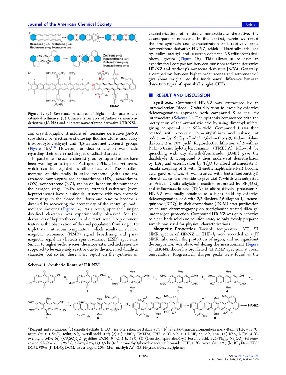 与并苯化学并行,我们的团队和其他人有一直在研究称为zethrene的Z型CPH,这可以被认为是二苯并菲。 最小的这个家族的成员基于六元环的数量被称为zethrene(Zth)和延伸的同系物是七甲基乙烯(HZ),octazethrene(OZ),nonazethrene(NZ)等等,。不同于并苯类,延伸zethrenes(来自七氢乙烯)具有醌结构和两个芳香族结构六重奏在封闭的外壳形式,并倾向于通过恢复中心醌二甲烷部分的芳香性成为一个双基(图1a)。结果,开壳单重双基特点是实验观察的七氢乙炔和八氮烯的衍生物。突出特征是在室温下观测到的从单线态到三线态的热粒子数,这导致核磁共振(NMR)信号增宽和在电子自旋共振(ESR)谱中的顺磁信号。类似于更高级别的并苯,更广泛的zethrenes是由于双自由基特点的增加,而变得极具反应性,但到目前为止,还没有一个稳定的非氮醌衍生物,即非并苯的副本的合成或表征的报道。在这方面,我们在这里报道首先合成和表征一个相对稳定的非氮醌衍生物HR-NZ,它是动力学稳定的通过大体积的信息和缺电子的3,5-三氟甲基 - 苯基(图1b)。这让我们有一个我们的非氮杂苯乙烯衍生物的实验比较HR-NZ和Anthony的非并苯衍生物JA-NA。通常,高级并苯和氮醌类之间的比较会给出一些洞察之间的根本区别这两种类型的开式壳单体CPH。