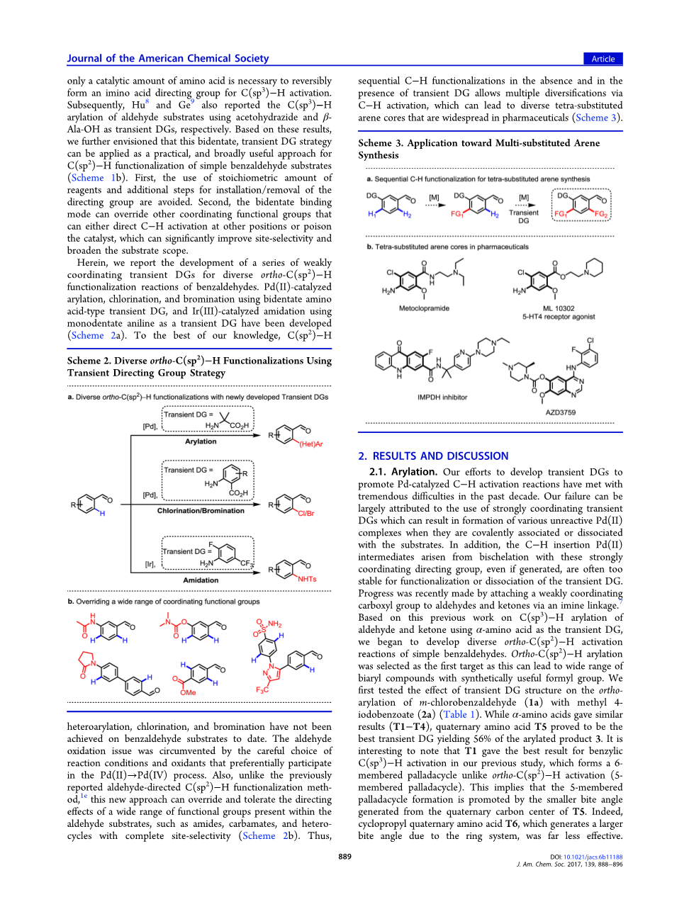 通过仔细选择优先参与Pd(II)→Pd(IV)过程的反应条件和氧化剂来避免醛氧化问题。 另外,不像以前那样报道的醛取代的C(sp2) - H官能化甲基 ,这种新方法适用醛基底中存在的各种官能团的导向效应,例如具有完全位点选择性的酰胺,氨基甲酸酯和杂环化合物。 从而,在不存在和存在瞬时导向基团情况下,合成在药物中广泛存在的各种芳烃化合物。
