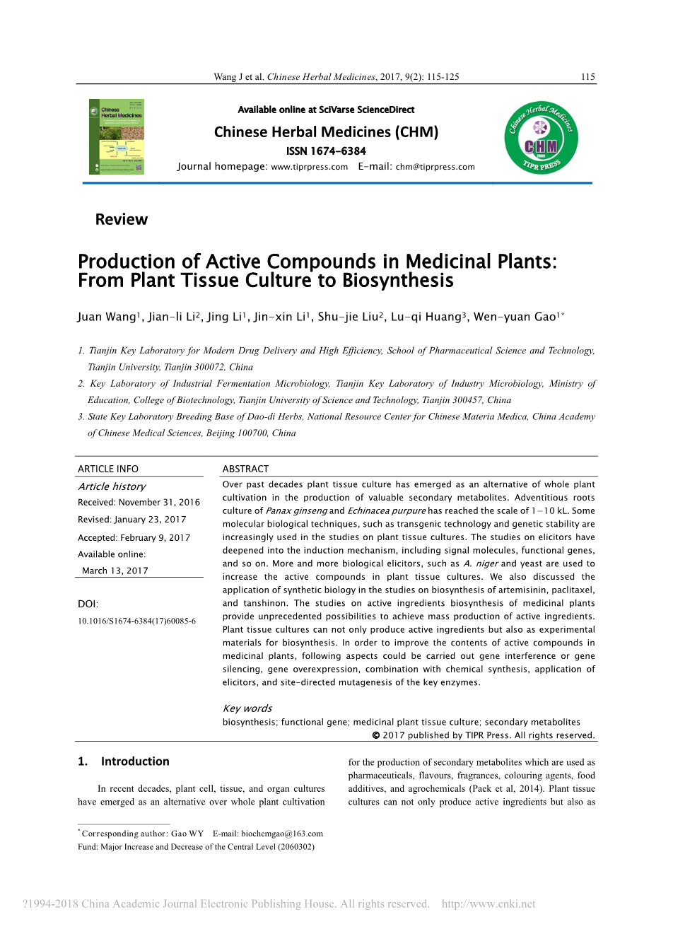 摘 要:在过去数十年中, 植物组织培养已成为一种替代植物的完整种植在生产宝贵的次生代谢物。人参和紫锥菊紫癜的不定根培养达到了 1minus;10的规模。转基因技术和遗传稳定性等分子生物学技术在植物组织培养研究中得到越来越广泛的应用。诱导的研究已深入到诱导机制中, 包括信号分子、功能基因等。越来越多的生物诱导, 如尼日尔和酵母, 用于增加植物组织培养中的活性化合物。我们还讨论了合成生物学在青蒿素、紫杉醇和丹参生物合成研究中的应用。药用植物活性成分在生物合成的研究中为实现大量生产活性成分提供了前所未有的可能性。植物组织培养能产生活性。