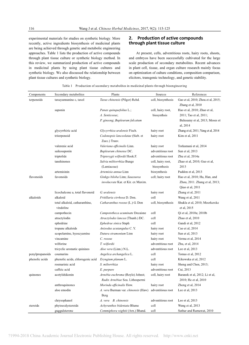 最近几十年里,在合成生物学的研究中,植物细胞、组织、器官已经作为完整的植物种植的实验材料的替代品而出现。最近, 药用植物的活性成分生物合成是通过遗传和代谢工程方法来实现的。表1列出了通过植物组织培养或合成生物学方法生产活性化合物。在本文中,我们利用植物组织培养和合成生物学方法对药用植物中活性化合物的生产进行总结。我们还讨论了植物组织培养与合成生物学的关系。