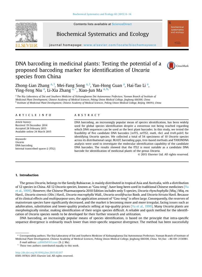 DNA条码是一种越来越流行的物种识别方法,它基于一种原理,即特定的序列散度通常比特定的序列散度低得多。该方法已成功应用于许多动物群体,作为一种高效的物种识别工具,使用了细胞色素氧化酶1(CO1)线粒体基因的一部分。与动物领域相比,建立一个标准化的DNA条码系统在植物中已经被证明是比较困难的,因为在进化历史和物种杂交方面(Kress等人,2005;Newmaster等,2006)。近年来,提出了几个不同的序列区域适用于植物的条码,包括nrITS (Kress 等,2005;蔡斯等,2005),nrITS2 (Chen 等,2010), matk (Lahaye等,2008),rbcL (Kress和Erickson, 2007)和trnH-psbA (Kress 等,2005)。一些研究人员已经采用了结合位点作为植物鉴别候选人条形码序列(克雷斯,2007;蔡斯等,2007;彭尼斯,2008),但还没有任何一个普遍的共识对所有植物物种DNA条形码。对于大多数特定种类的物种来说,最合适的DNA条码必须通过测序和结果分析来选择。
