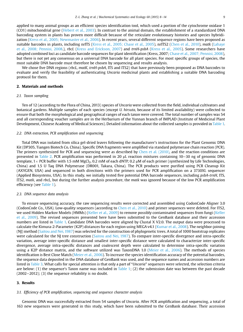 为了确保测序的准确性,对原始测序结果进行了校正,并使用CodonCode一致性3.0(CodonCode Co.,USA)进行了组装。低质量的序列(根据Chen等,2010)和引物序列被删除。对于ITS2,我们使用隐马尔可夫模型(HMMs) (Keller等,2009)来去除真菌中可能被污染的序列(Keller et al.,2009)。这里提交的修改后的序列已提交给GenBank数据库,它们的加入编号列在表1中。候选DNA条码与Clustal X V2.0一致。通过使用MEGA v4.1 (Kumar等, 2008),对输出数据进行处理,计算每个区域的Kimura-2-Parameter (K2P)距离。采用邻域法(Saitou 和 Nei, 1987)构建了系统发育树。为NJ树结构(Saitou和Nei, 1987)计算了1000个引导复制。为了比较特定的散度和内比的变化,计算平均间距离和最小的间距离,以描述特定的散度,计算出平均内部距离和聚结深度,用K2P距离矩阵来确定内部的变异,使用的软件是分类法1.0 (Meier等,2006)。物种鉴定方法最接近(Meier等,2006)。为了提高潜在条码的物种识别精度,使用GenBank DNA数据库中存储的序列数据,并在表3中列出序列名称和加入编号。需要特别注意的是,只选择了钩藤属序列的一部分,选择标准如下:(1)表1中包含了序列的分类单元名称;(2)提交日期在过去十年(2002年至2012年)之间;(3)序列的可靠性是毫无疑问的。