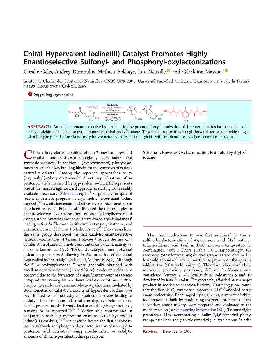 手性gamma;-丁内酯(二氢呋喃-2-酮)是在多种生物活性天然和合成产物中发现的流行基序。1 另外,gamma;-(羟甲基)-gamma;-丁内酯是合成各种天然产物的有价值的关键组成部分。2 在报道的gamma;-(氧甲基)-gamma;-丁内酯方法中,2,3 由高价碘介导的4-戊烯酸的直接氧化环化(III)代表从容易获得的前体开始的最直接的方法之一(方案1,等式1)。4 令人惊讶的是,尽管最近在不对称超价碘催化方面取得了令人瞩目的进展,5,6很少有效的对映选择性氧内酯化迄今已被记录。 例如藤田等。7 公开了使用化学计算量的基于乳酸盐的芳基-lambda;3 - 碘烷6的邻烯基苯甲酸酯4的对映选择性氧内酯化的第一实例导致6-内delta;delta;内酯5具有优异的区域,非对映,和对映选择性(方案1,方法A,方程2)。三年后,同一组通过使用化学计量的辅助氧化剂即间氯过苯甲酸(mCPBA)和催化量的手性碘代芳烃前体8的组合开发了末端烯烃的第一催化对映选择性羟基内酯化,允许原位形成手性超价碘催化剂(方案1,方法B,方程2)。 尽管通常以极好的对映选择性(高达90%ee)获得delta;-syn-羟基内酯7,但由于形成了显着量的来自mCPBA直接氧化4的外消旋反产物,因此观察到中等产率。 尽管取得了这些进展,但由化学计量或催化量的高价碘介导的对映选择性环化仅限于几何限制的底物,导致内源转化和对更灵敏的前体进行甲基化,从而产生有价值的gamma;-丁内酯,仍有待报道。4g,i,6minus;9 在这种情况下,并结合我们对对映选择性超价碘(III)催化的兴趣,6b,10 我们在这里描述了第一个对映体 -非刚性4-烯烃的有意磺酰基 - 和磷酰基 - 氧乙酰化,使用化学计量或催化量的手性超价碘前体制备戊烯酸衍生物。