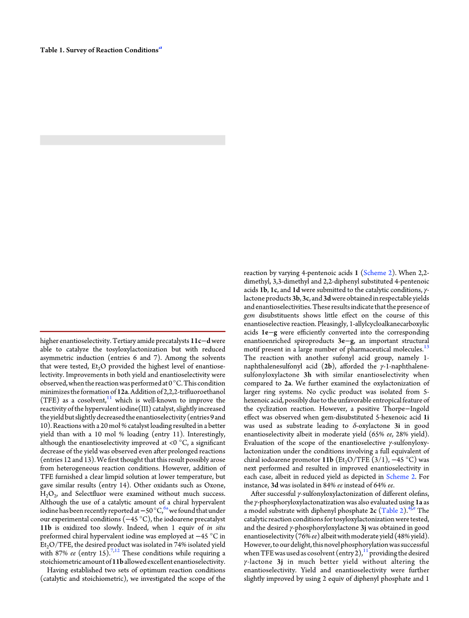 手性碘代芳烃87 (1a)与对甲苯磺酸(2a)在Et2O中室温下的gamma;-磺酰氧基内酯化与mCPBA(表格1)。 令人失望的是,回收的gamma;-甲苯磺酰氧基甲基-gamma;-丁内酯3a与环氧化物加合物12a(50%收率,条目1)一起以低收率作为几乎外消旋混合物获得。 因此,考虑具有不同主链的替代手性碘代芳烃前体(条目2-4)。 由Kita开发的轴向手性碘代芳烃9和106d,g 和我们一样,6b 分别命名为3a,为中等对映体选择性的主要产物。 令人满意的是,我们发现了灵活的C2 - 对称碘代芳烃11a6e,f 提高了对映选择性。 受到这一结果的鼓舞,各种手性碘代芳烃11,通过调节其空间特性而建立仲酰胺部分,并在模型反应中进行评估(参见支持信息(SI))。 照射下,含有庞大的2,4,6-三甲基苯基的预催化剂11b得到gamma;-甲苯磺酰氧基甲基-gamma;-丁内酯3a有着更高的对映体选择性。叔酰胺预催化剂11c-d能够催化甲苯磺酰氧基内酯化,但不对称诱导减少(条目6和7)。 在所测试的溶剂中,Et2O提供最高水平的对映体选择性。 观察到产率和对映体选择性均有所改善,当0℃时发生反应。 这个条件使12a的变形最小化。 加入2,2,2-三氟乙醇E)作为共溶剂,11 这是众所周知的改善高价碘(III)催化剂的反应性,轻微增加可能会轻微降低对映选择性(条目9和10)。 与20mol%催化剂负载量相比,用10mol%负载量(条目11)产生更好的收率。 有趣的是,尽管对映选择性在lt;0°C时有所改善,但即使在长时间反应(条目12和13)后,也观察到产率显着降低。 我们首先认为这个结果可能来自异质反应条件。 然而,加入TFE在较低的温度下提供清澈透明的溶液,但得到类似的结果(条目14)。 其他氧化剂,如Oxone,H2O2和Selectuor检查没有太大的成功。 尽管使用催化量的手性超价碘最近报道了在-50℃,6a我们发现在我们的实验条件(-45℃)下,碘代芳烃预催化剂11b被氧化得太慢。 事实上,当1当量的原地在-45℃下使用预先形成的手性高价碘Et2O / TFE,期望的产物以74%的分离产率与87%ee(条目15)分离。7,12 这些条件同时要求化学计量比为11b允许出色的对映选择性。 建立了两套最佳反应条件(催化剂和化学计量比)后,我们研究了该催化剂的范围通过改变4-戊烯酸1(方案2)。 当2,2-将二甲基,3,3-二甲基和2,2-二苯基取代的4-戊烯酸1b,1c和1d置于催化条件下,可以得到gamma;-内酯产物3b,3c和3d,其具有可预期的对映选择性和对映选择性。 这些结果表明,宝石不成分的存在在这个过程中显示出很小的影响对映选择性反应。 令人愉快的是,1-烯丙基环烷羧酸1e-g被有效地转化为相应的对映体螺旋产物3e-g,这是存在于大量药物分子中的重要结构基元。13 与另一个磺酰基团即1-萘磺酰基酸(2b)的反应为gamma;-1-萘 -磺酰氧基内酯3h与2a相比具有相似的对映选择性。 我们进一步研究了羟基内酯化