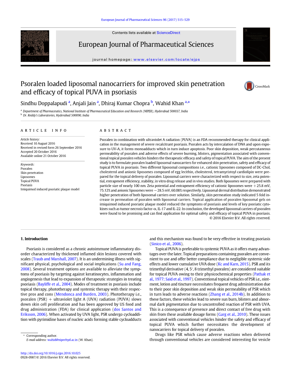 补骨脂素负载脂质体纳米载体用于改善皮肤渗透和局部PUVA在牛皮癣中的功效