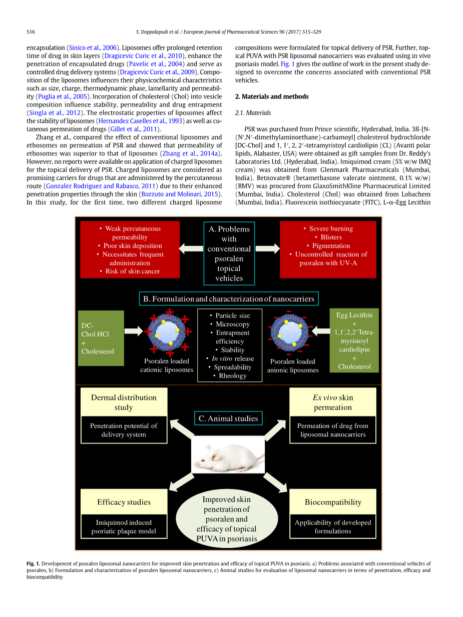 张等人比较了常规脂质体和醇质体对PSR渗透的影响,并显示醇质体的渗透性优于脂质体 (Zhang et al., 2014a)。然而,没有关于带电脂质体被应用于局部递送PSR的报道。带电脂质体被认为是通过经皮途径施用的有希望的药物载体(Gonzalez Rodriguez和Rabasco,2011),因为它们透过皮肤的穿透性增强 (Bozzuto和Molinari,2015)在这项研究中,首次配制了两种不同电荷的脂质体组合物用于局部递送PSR。此外,使用体内牛皮癣模型评估具有PSR脂质体纳米载体的局部PUVA。 图1给出了本研究中的工作大纲,旨在克服与常规PSR相关的问题。