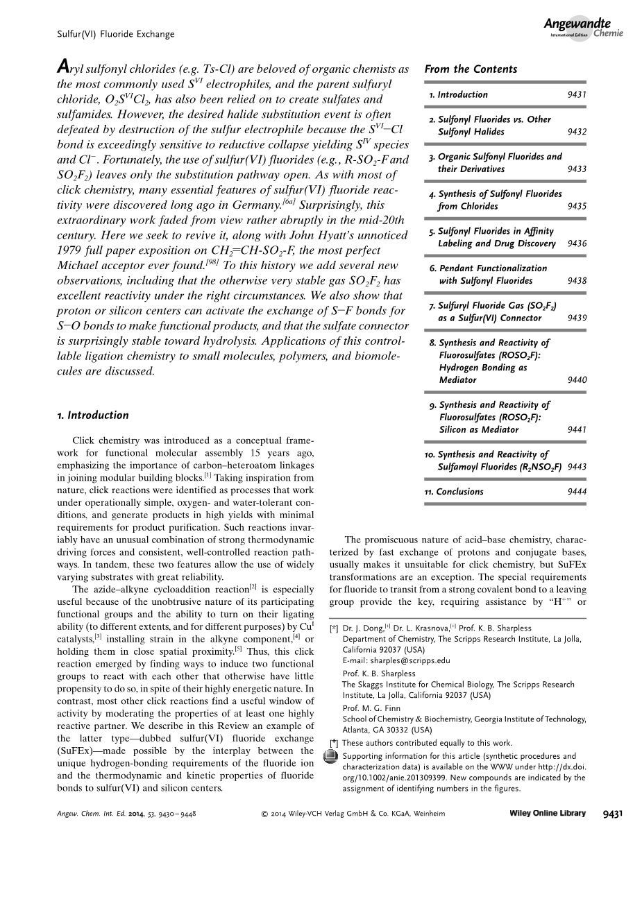 磺酰氯是有机化学家最喜爱的SVI亲电子试剂。其中(KBS)对SVI化学的兴趣大约在30年前开始,当RSO2Cl和ClSO2Cl未能作为可靠的连接单元时,硫(Ⅵ)和氯之间的键还原容易失效。 这个2-OR#39;,RNH-SO2-NHR#39;和ArO-SO2-NRR#39;的无机硫酸盐,磺酰胺和氨基磺酸盐连接的反应形成,竟然出现了。我们因此试图开发用于快速反应复杂分子和稳健的无机连接因此被延迟。 现在又回到了这个问题,我们认为磺酰氟和相关的组成部分包含碳(C-SO2F)和杂原子结合(N-SO2F和O-SO2F)的多用途点击化学。
