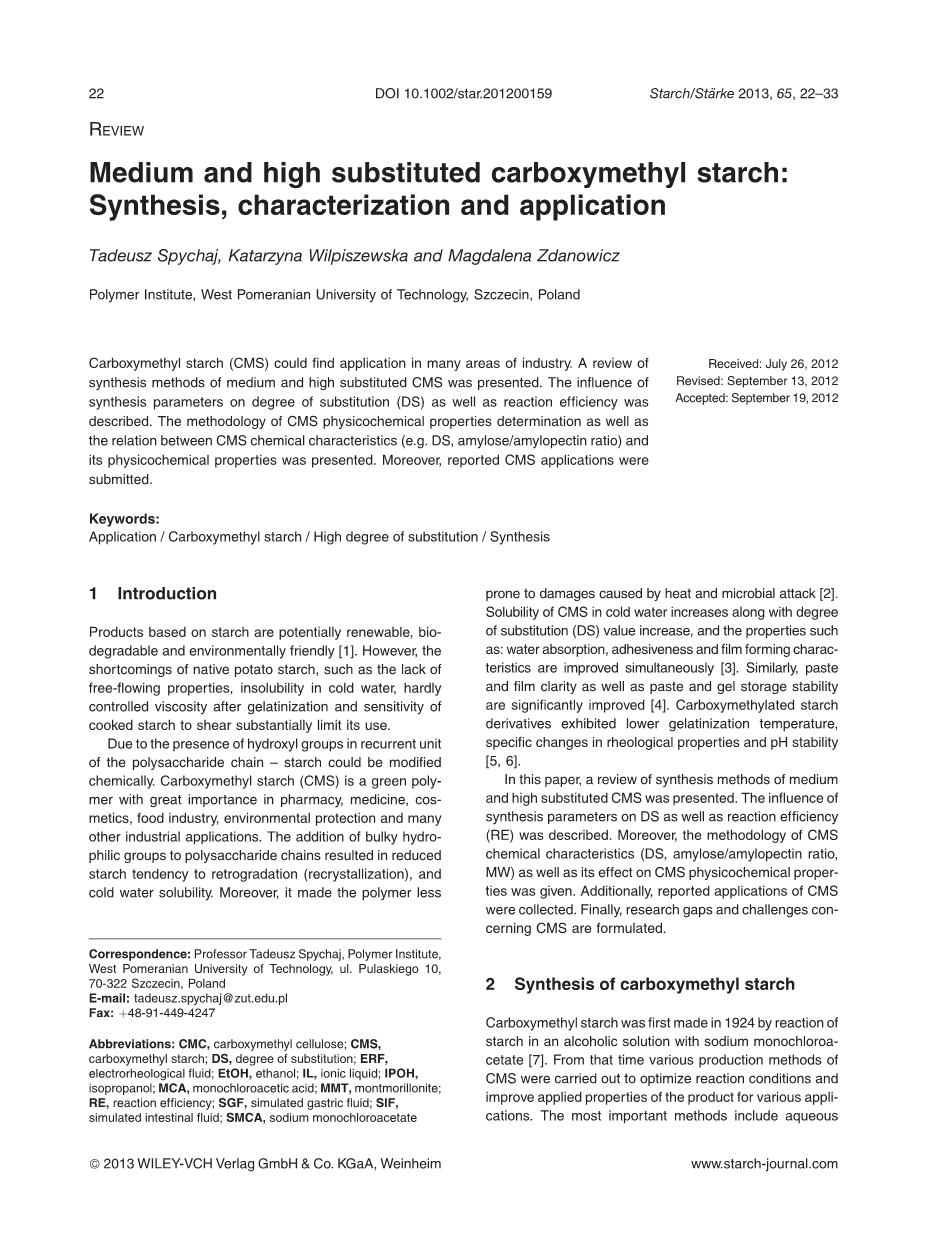 羧甲基淀粉(CMS)可以在工业的许多领域得到应用。综述了中、高取代CMS的合成方法。描述了合成参数对取代度(DS)的影响以及反应效率。本文介绍了CMS理化性质的测定方法,以及CMS的化学特性(如:ds、直链淀粉/支链淀粉比)与化学性质的关系。此外,CMS的应用也被报告。