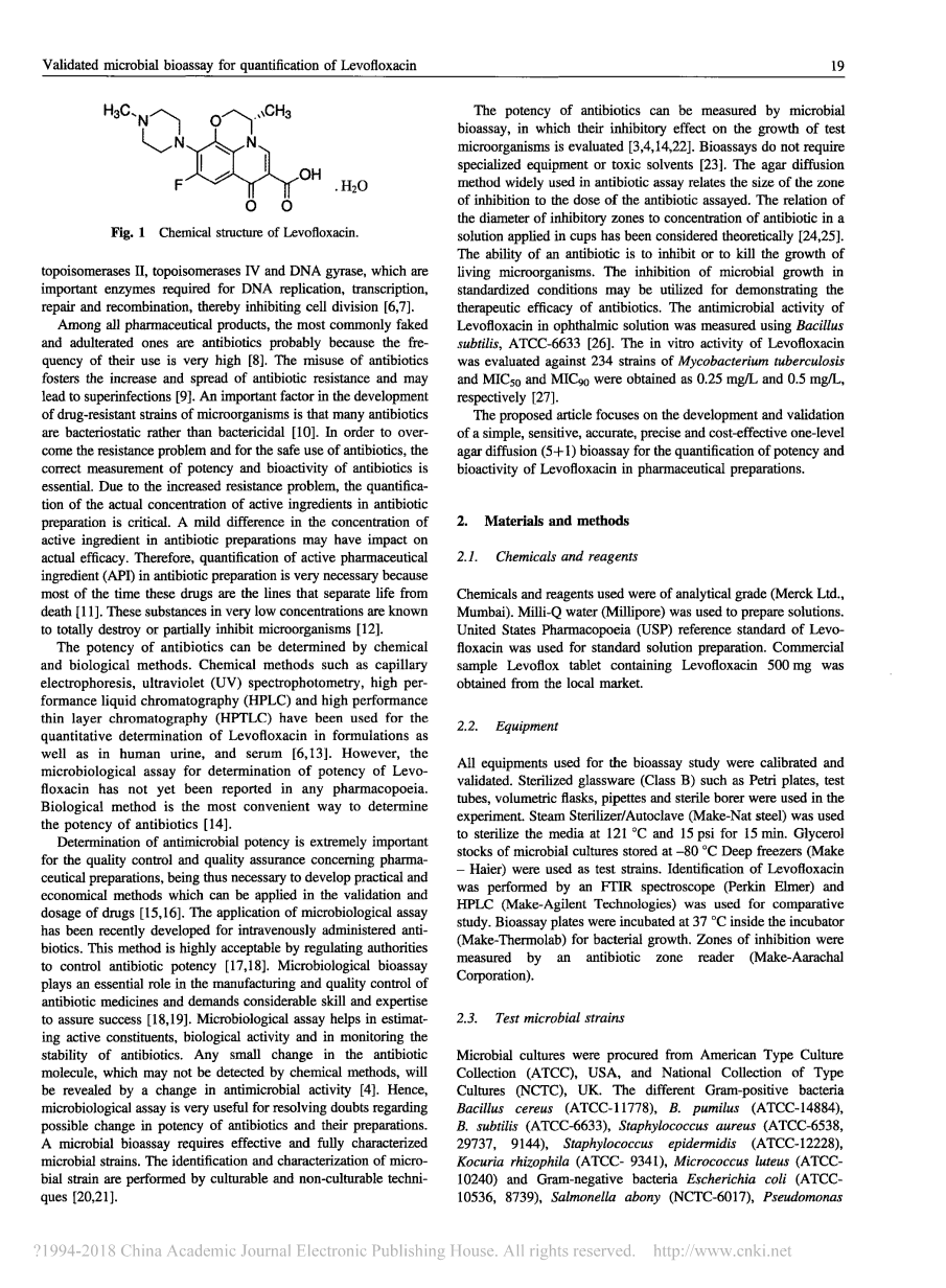 抗生素的效力可以通过微生物生物测定来测量,其中它们对测试微生物生长的抑制作用被评估。生物测定不需要专门的设备或有毒溶剂[23]。广泛用于抗生素测定的琼脂扩散方法将抑制区域的大小与测定的抗生素的剂量相关联。理论上已经考虑了在杯中应用的溶液中抑制区的直径与抗生素浓度的关系[24,251。抗生素的能力是抑制或杀死活微生物的生长。在标准化条件下抑制微生物生长可用于抗恶性肿瘤的治疗功效。使用枯草芽孢杆菌ATCC-6633 [26]测量左氧氟沙星在眼用溶液中的抗微生物活性。对234株结核分枝杆菌进行了左氧氟沙星的体外活性评估,MIC50和MIC90分别为0.25 mg / L和0.5 mg / L [27]。