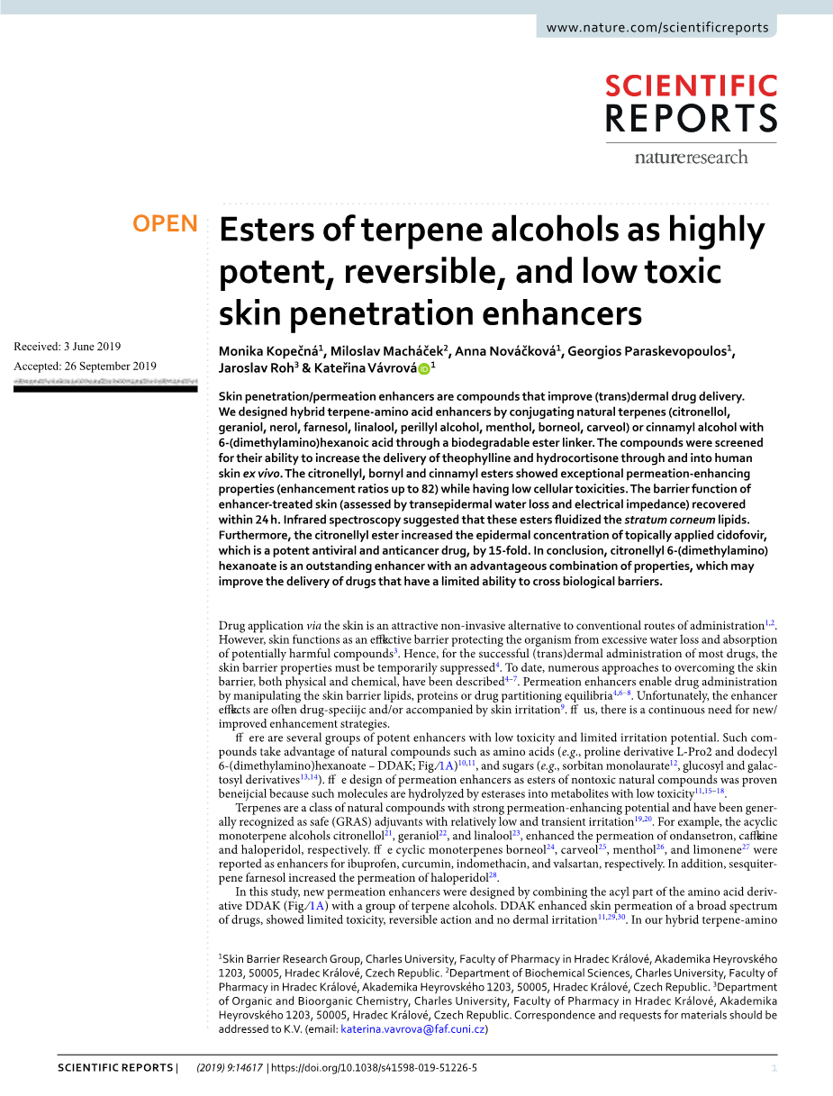 查尔斯大学皮肤屏障研究组,设在捷克共和国赫拉迪克克拉洛夫的阿卡德米卡·海罗夫斯克的药学系,邮编:1203,50005。“查理斯大学生物化学科学系,赫拉迪克·卡拉洛夫的药学院,阿卡德米卡·海罗夫斯克霍1203,50005,赫拉迪克·卡拉洛夫,捷克共和国。有机和生物有机化学系,查尔斯大学,设在捷克共和国赫拉迪克卡拉洛夫的药剂系,阿卡德米卡·海罗夫斯克霍1203,50005。信件和对材料的要求应发至凯威(电邮:katerina.vavrova@faf.cuni.cz)
