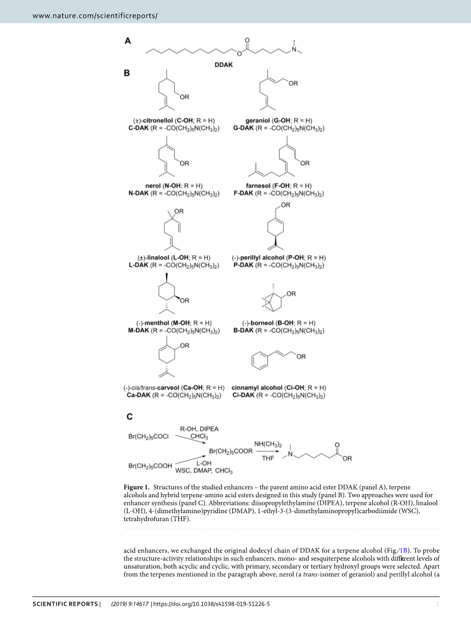 图1所研究的增强剂的结构——母体氨基酸酯DDAK(图一),本研究中设计的萜烯醇类和杂合萜烯-氨基酸酯(图B)。两种方法用于增强子合成(图C)。缩写:二异丙基乙胺(DIPEA),萜烯醇(R-OH),芳樟醇(1-羟基)、4-(二甲氨基)吡啶(DMAP)、1-乙基-3-(3-二甲氨基丙基)碳二亚胺(WSC)、四氢呋喃(THF)。