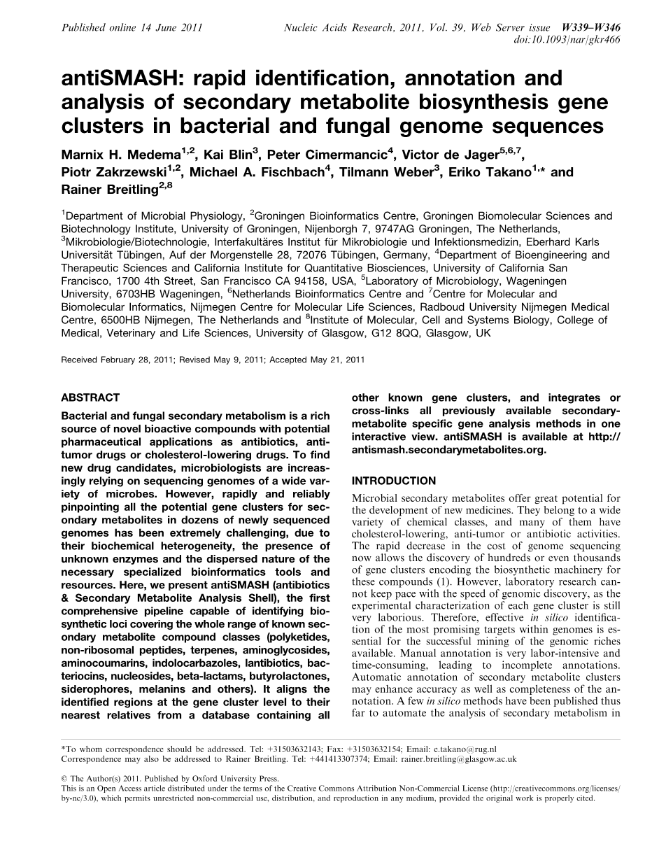 Marnix H. Medema1,2, Kai Blin3, Peter Cimermancic4, Victor de Jager5,6,7, Piotr Zakrzewski1,2, Michael A. Fischbach4, Tilmann Weber3, Eriko Takano1,* and Rainer Breitling2,8
