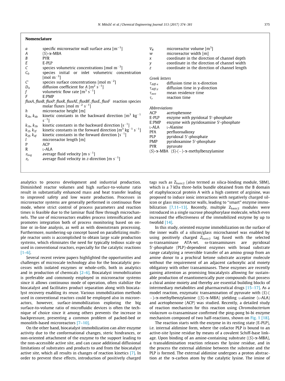 在这项研究中,通过使用与所选xtransaminase ATA-wt融合的带正电的Z基本2标签,可以将定向酶固定在硅/玻璃微通道内壁的表面。x-转氨酶是吡ido醛50-磷酸(PLP)依赖性酶,具有广泛的底物范围可催化氨基从胺供体向前手性酮底物受体分子的可逆转移,而无需相邻的羧酸部分与其他转氨酶共同作用。这些酶作为有前 途的生物催化剂而受到关注,因为它们可以可持续地生产具有手性胺部分的对映体纯化合物,因此是中间代谢物和药物的基本组成部分。最近,对使用紫细菌x-转氨酶进行该反应的反应机理进行的详细研究证实,乒乓双双酶机理由两个半反应组成,如图1所示[18]。