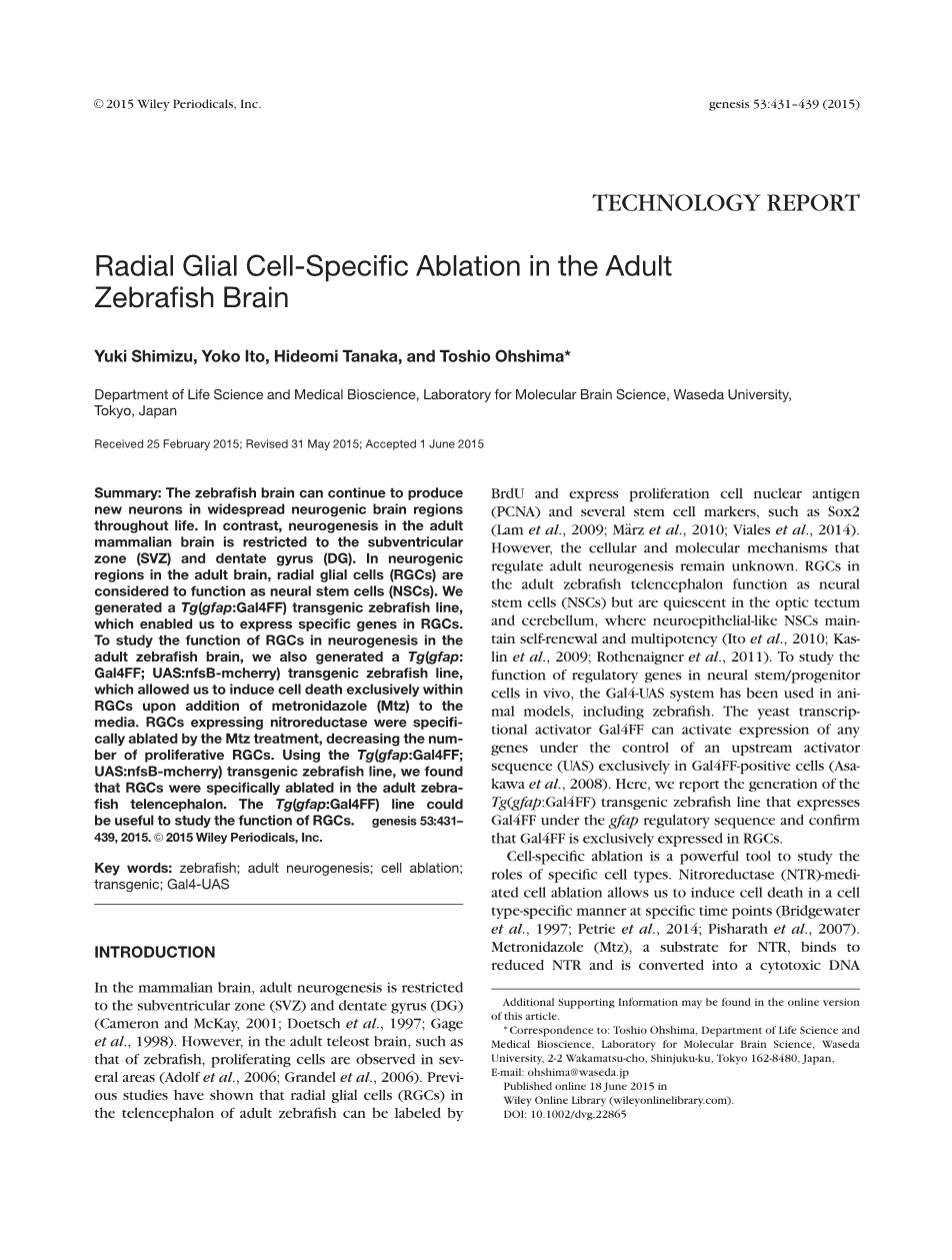 介绍:在哺乳动物的大脑中,成体神经发生仅限于脑室下区域(SVZ)和齿状回(DG)(Cameron和McKay,2001;Doetsch等,1997;Gage等,1998)。但是,在成年硬骨鱼脑(例如斑马鱼的脑)中,在几个区域观察到了增殖细胞(Adolf等,2006;Grandel等,2006)。先前的研究表明,成年斑马鱼端脑内的放射状胶质细胞(RGCs)可以被BrdU标记,并表达增殖细胞核抗原(PCNA)和一些干细胞标记物,如Sox2(Lamet al.,2009;M Eurzet al.,2010;Vialesset al.,2014)。然而,调节成体神经发生的细胞和分子机制仍然未知。成年斑马鱼末梢脑中的RGCs具有神经干细胞(NSCs)的功能,但在视顶盖和小脑处于休眠状态,其中神经上皮样NSCs保持自我更新和多功能性(Ito等,2010;Kaslin等,2009;Rothenaigner等,2011)。为了研究体内神经干/母细胞中调节基因的功能,Gal4-UAS系统已用于包括斑马鱼在内的动物模型中。酵母转录激活因子Gal4FF可以仅在Gal4FF阳性细胞中在上游激活序列(UAS)的控制下激活任何基因的表达(Asakawa等,2008)。在这里,我们报告了在gfap调控序列下表达Gal4FF的Tg(gfap:Gal4FF)转基因斑马鱼品系的生成,并证实了Gal4FF仅在RGCs中表达。