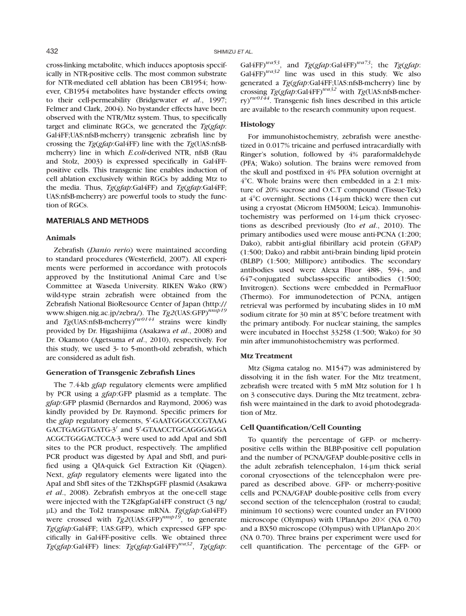 使用gfap:GFP质粒作为模板,通过PCR扩增7.4-kb gfap调控元件。gfap:GFP质粒(Bernardos和Raymond,2006)由Raymond博士提供。gfap调控元件5`-GAATGGGCCCGTAAGGACTGAGGTGATG-3`和5`-GTAACCTGCAGGGAGGA ACGCTGGGACTCCA-3`的特异性引物将通过ApaI和SbfI位点分别添加到PCR产物中。通过ApaI和SbfI消化扩增的PCR产物使用QIA-快速凝胶提取试剂盒(Qiagen)纯化。接下来,将gfap调节元件连接至T2KhspGFF质粒的ApaI和SbfI位点(Asakawa等,2008)。向单细胞阶段的斑马鱼胚胎中注射了T2KgfapGal4FF构建体(3ng/Il)和Tol2转座酶mRNA。Tg(gfap:Gal4FF)将其与Tg2(UAS:GFP)nnsp19杂交,生成Tg(gfap:Gal4FF;UAS:GFP),其在Gal4FF阳性细胞中特异性表达GFP。我们获得了三个Tg(gfap:Gal4FF)品系:Tg(gfap:Gal4FF)wa32,Tg(gfap:Gal4FF)wa53和Tg(gfap:Gal4FF)wa73;在该研究中使用了Tg(gfap:Gal4FF)wa32系。我们还通过将Tg(gfap:Gal4FF)wa32与Tg(UAS:nfsB-mcherry)rw0144杂交来生成Tg(gfap:Gal4FF;UAS:nfsB-mcherry)品系。本文所述的转基因鱼系可应要求提供给研究机构。