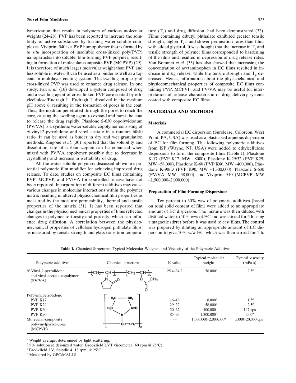 上面讨论的所有水溶性聚合物都是潜在的聚合物膜改性剂,可实现改善的药物释放。迄今为止,尚未报道对包含PVP,MCPVP和PV / VA控释的复合EC薄膜的研究。掺入不同的添加剂可能会导致聚合物基体内分子相互作用的各种变化,从而导致物理化学薄膜性质发生变化,这是通过基体的透湿性,热和拉伸性质来衡量的(31)。据报道,薄膜的物理力学性能的变化反映了聚合物曲折度和孔隙度的变化,这会影响药物的扩散。已经证明,通过拉伸强度和玻璃化转变温度(Tg)和药物扩散所测量的纤维素氢邻苯二甲酸氢盐薄膜的物理机械性能之间存在相关性(32)。含有邻苯二甲酸二丁酯的薄膜与添加甘油的薄膜相比,具有更高的拉伸强度,更高的Tgs和更低的渗透速率。认为聚合物膜的Tg和拉伸强度的增加对应于膜的硬化并且导致药物释放速率降低。 Van Bommet等。 (33)还表明增加EC膜中对乙酰氨基酚的浓度导致药物释放增加,而抗张强度和Tg降低。因此,有关包含PVP,MCPVP和PV / VA的复合EC膜的理化和物理力学性能的信息可能有助于解释复合EC膜包衣的药物释放系统的释放特性。