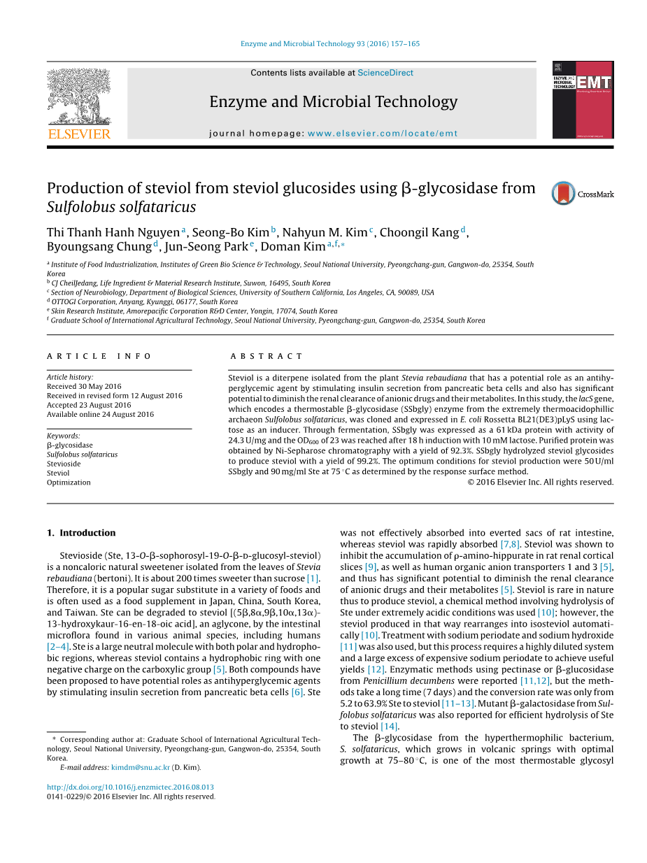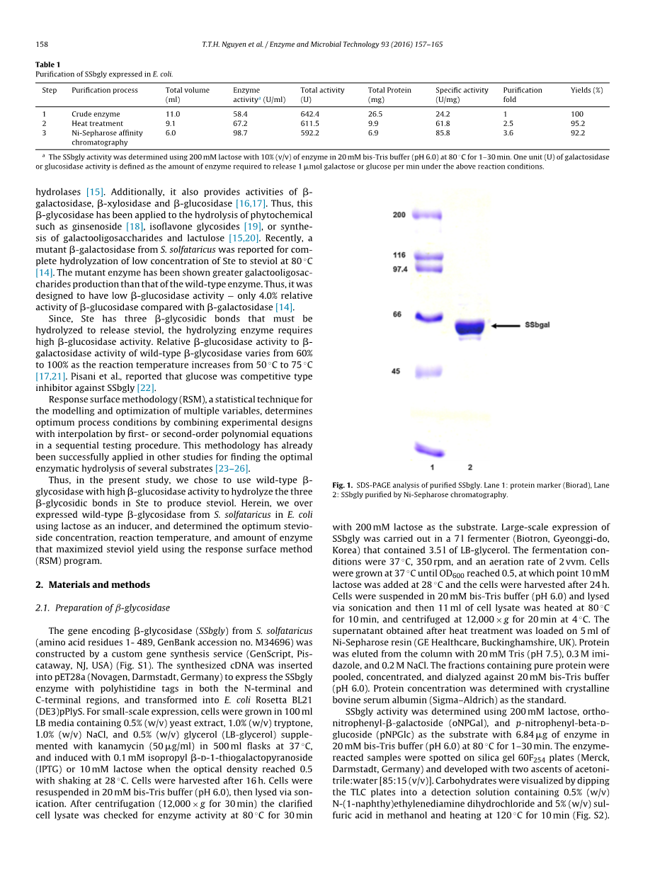 因此,在本研究中,我们选择使用具有高 beta;-葡糖苷酶活性的野生型 beta;-糖苷酶来水解甜菊糖中的三个 beta;-糖苷键以生产甜菊醇。在本文中,我们在大肠杆菌中过量表达了来自硫磺矿硫化叶菌野生型 beta;-糖苷酶,并使用乳糖作为诱导剂,并使用响应面法(RSM)程序确定了使甜菊醇产量最大化的最佳甜菊糖浓度,反应温度和酶量。