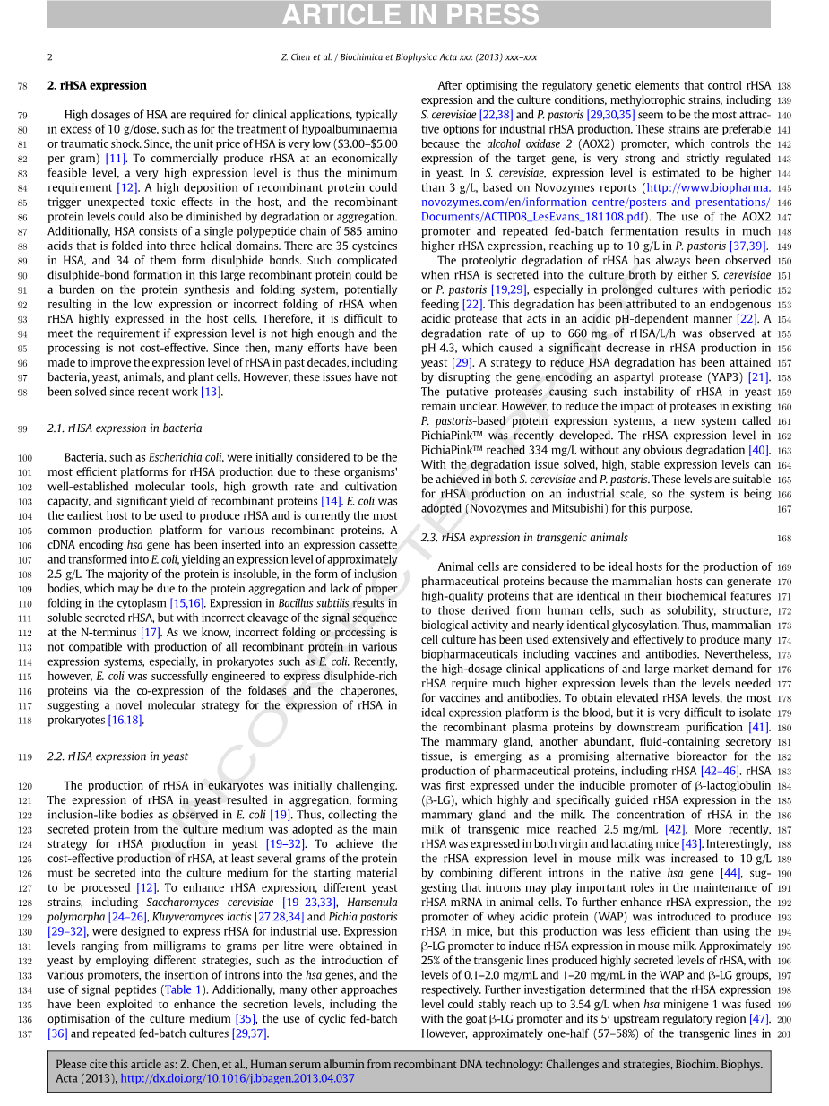 在真核生物中产生rHSA最初是具有挑战性的。在大肠杆菌中观察到rHSA在酵母中的表达会导致聚集,形成包涵体[19]。因此,从培养基中收集分泌蛋是酵母生产rHSA的主要策略[19-32]。为了获得成本效益生产rHSA,至少几克蛋白质必须分泌到培养基中,以开始的材料处理[12]。为了增强rHSA的表达,我们设计了不同的酵母菌株,包括酿酒酵母[19 - 23,33]、多形汉森酵母[24-26]、乳酸克鲁维酵母[27,28,34]和毕赤酵母[29-32]来表达工业用的rHSA。表达水平从毫克到克每升获得酵母采用不同的策略,如引入不同的启动子,hsa基因的内含子插入和使用的信号肽(表1)。此外,许多其他方法一直利用提高分泌水平,包括优化的培养基[35],使用循环馈料式[36]和重复馈料式文化[29,37]。