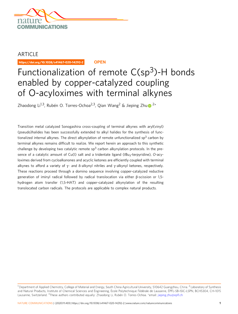 过渡金属催化的末端炔烃与芳基(乙烯)(伪)卤化物的Sonogashira交叉偶联已成功地推广到烷基卤化物中,用于合成功能化内炔烃。末端炔烃对远端未功能化sp3碳的直接烷基化仍然很难实现。我们在此报告了一种方法,通过开发两个催化远sp3碳炔化反应来解决这一合成挑战。在Cu(I)盐和三齿配体(tBu3-terpyridine)的催化作用下,由环烷酮和无环酮衍生的O-酰基肟与末端炔有效偶联,分别得到各种gamma;-和delta;-炔基腈和gamma;-炔基酮。这些反应通过多米诺骨牌序列涉及铜催化的亚胺基自由基的还原生成,然后通过beta;-断裂或1,5-氢原子转移(1,5-HAT)和铜进行自由基易位-催化的炔基化反应生成的易位碳原子团。该反应适用于复杂的自然产物。