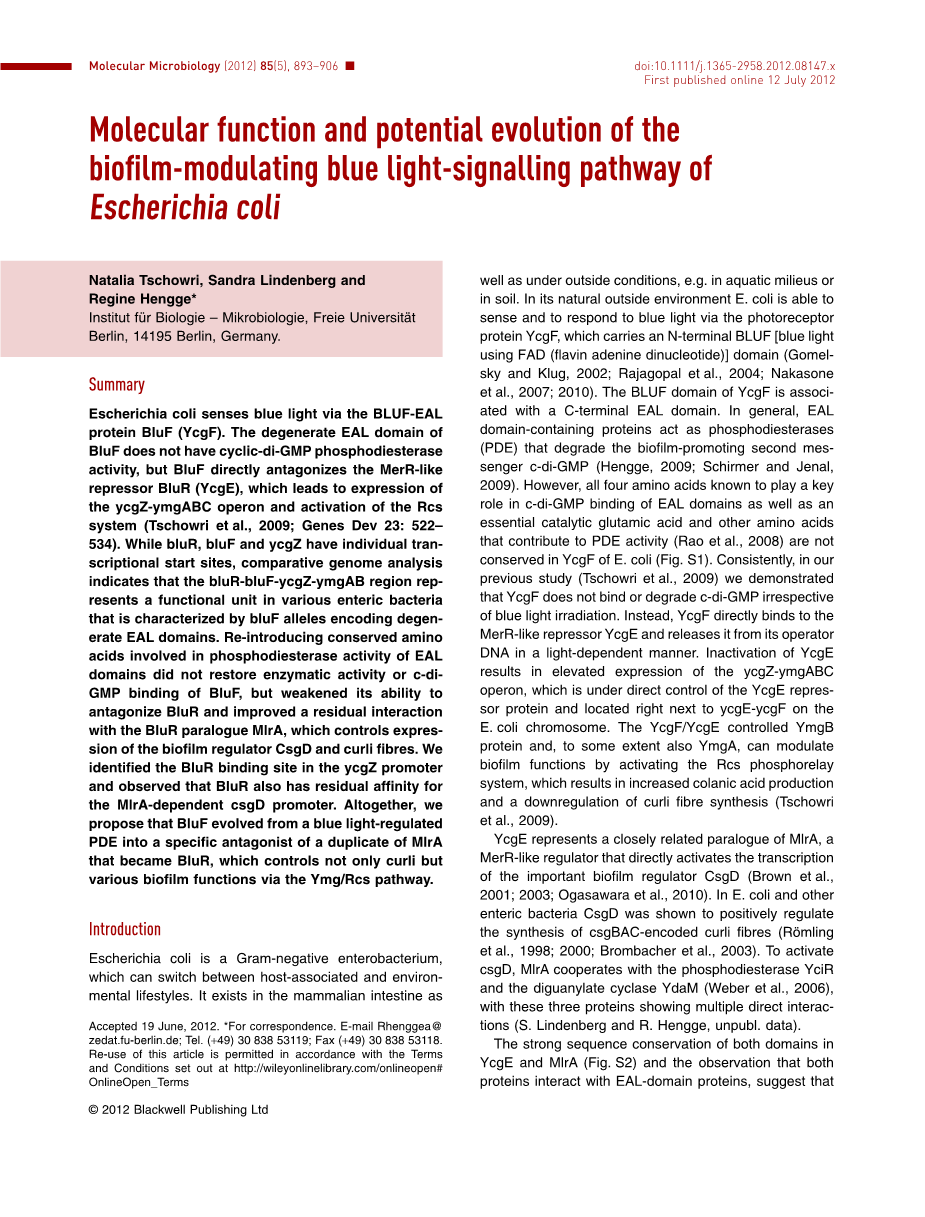 大肠杆菌是一种革兰氏阴性肠杆菌,可以在宿主相关的生活方式和环境生活方式之间切换。它存在于哺乳动物的肠道以及外界条件下,例如在水生环境或土壤中。在自然的外部环境中,大肠杆菌能够通过感光蛋白YcgF感知并响应蓝光,该蛋白带有N端BLUF [使用FAD(黄素腺嘌呤二核苷酸)的蓝光]域(Gomelsky和Klug, 2002; Rajagopal等,2004; Nakasone等,2007; 2010)。 YcgF的BLUF结构域与C端EAL结构域相关联。通常,含EAL结构域的蛋白质起磷酸二酯酶(PDE)的作用,降解降解生物膜的第二种信使c-di-GMP(Hengge,2009; Schirmer and Jenal,2009)。但是,已知在EAL结构域的c-di-GMP结合中起关键作用的所有四个氨基酸,以及必需的催化谷氨酸和其他有助于PDE活性的氨基酸(Rao等人,2008)都不保守。在大肠杆菌的YcgF中(图S1)。一致地,在我们先前的研究(Tschowri等,2009)中,我们证明了YcgF不会结合或降解c-di-GMP,而与蓝光无关。相反,YcgF直接与类似MerR的阻遏物YcgE结合,并以光依赖性方式将其从其操纵基因中释放出来。 YcgE的失活导致ycgZ-ymgABC操纵子的表达升高,它在YcgE受体蛋白的直接控制下位于大肠杆菌染色体上的ycgE-ycgF旁边。 YcgF / YcgE控制的YmgB蛋白,在一定程度上还可以控制YmgA,可以通过激活Rcs磷酸酶系统调节生物膜功能,从而导致可乐酸产量增加和卷曲纤维合成的下调(Tschowri等,2009)。