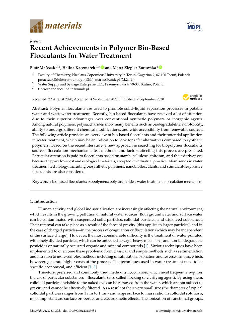 本文主要介绍了近年来以多糖及其衍生物或共聚物为主要材料的天然生物絮凝剂在水处理中的应用。此外,简述了絮凝过程的机理、新型絮凝剂的试验方法及影响絮凝净化过程的因素。特别是新型生物合成絮凝剂、纳米(生物)絮凝剂和智能(智能)材料。由于大量的文学在水处理的絮凝和狭窄;方面个人发表的作品,我们的目的是总结在一篇文章中收购新生物材料上的最新成果絮凝剂制造、研究方法包括测定过程有效性和未来趋势。同时,简要介绍絮凝机理的基础知识,以充分、全面地涵盖本课题。