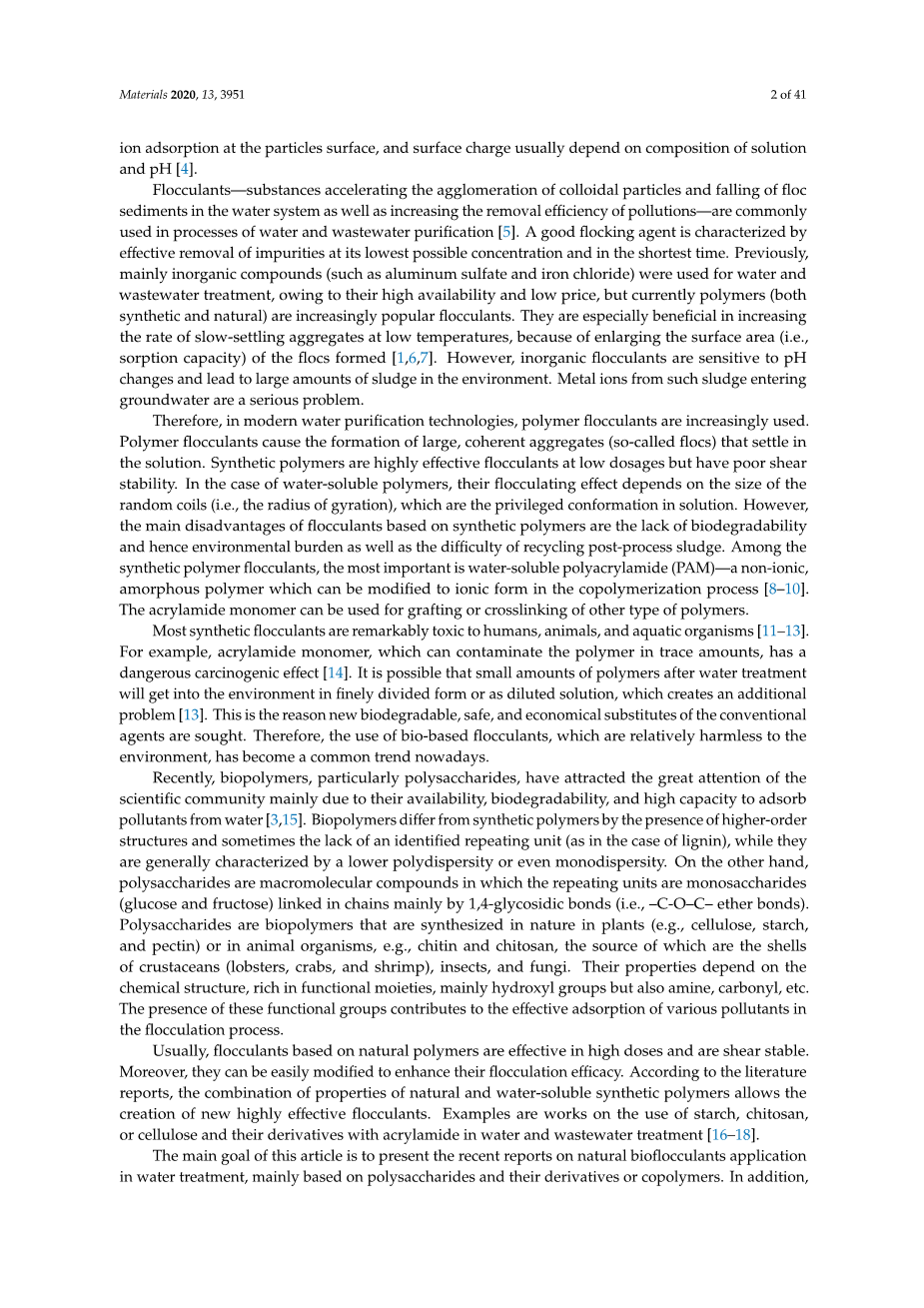 絮凝剂是一种能加速水系统中胶体颗粒的聚集和絮凝沉淀物的下落以及提高污染物去除效率的物质,是水和废水净化[5]过程中常用的物质。良好的电着剂的特点是在尽可能低的浓度和最短的时间内有效地去除杂质。以前,水和废水处理主要使用无机化合物(如硫酸铝和氯化铁),因为它们的高可用性和低价格,但目前聚合物(合成和天然)是越来越受欢迎的絮凝剂。在低温下,它们尤其有利于提高慢沉集料的速率,因为它们扩大了形成的絮凝体的表面积(即吸附能力)[1,6,7]。然而,无机絮凝剂对pH值的变化非常敏感,导致环境中产生大量的污泥。这些污泥中的金属离子进入地下水是一个严重的问题。