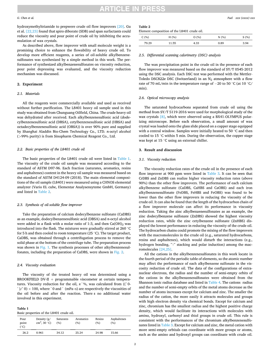 随着我国常规原油的枯竭,重油已成为碳氢化合物能源的重要后继来源。稠油粘度高,难以从储层中提取[1,2]。一般来说,原油的理化性质对萃取过程有很大的影响。人们认为,原油中含有大量的树脂和沥青质[3-6],这使得原油的粘度较高[5,7]。树脂和沥青质分子中的极性基团也有助于树脂/沥青质分子的聚集和原油的高粘度的形成[6,8-11]。此外,原油中含有长链的饱和烃在一定的温度和压力条件下可以结晶形成三维网络结构。蜡层会限制稠油的流动,导致油井和管道堵塞,限制稠油的采收率[11-13]。近年来,蒸汽驱动、蒸汽吞吐和蒸汽辅助重力泄油(SAGD)等热提高采收率(EOR)方法被广泛应用于稠油开采。这些方法主要集中在人工举升过程中降低稠油粘度。而我国部分地区的稠油油藏埋藏较深,在深井注汽过程中热损失较大。[14]注汽需要大量淡水,需要进行分离,这需要额外的设备和成本。此外,当地面上的管道中存在重油时,重油可能会再次流入。通过加入流动改进剂来降低稠油粘度是一种很有前途的方法,因为它方便且成本低[15,16]。它不仅用于原油开采,而且在保证稠油流动方面也起着重要作用。用于降低稠油粘度的一些流动改进剂(如聚合物) [16]在精炼过程中很难分解,因此从废弃物和自然资源中注入小分子化学物质来改善稠油的流动性是合理的。[17]基于这一假设,近年来我们在小分子原油流动改善剂的研究上做了很多的努力,取得了一些进展[2,21,22]。陈等将废弃的聚甲基丙烯酸甲酯通过酯交换和氨解合成聚甲基丙烯酸甲酯和聚甲基丙烯酰胺,作为降凝剂和降粘剂,将部分废弃物改性成有用的化学品。[18,19]张等利用植物油和脂肪酸羟甲基三酰胺制备原油流动改进剂[20]。谷等[22,23]研究发现,二硼酸spiro (SDB)和span表面活性剂通过抑制蜡晶体的积聚,可以降低原油的粘度和倾点。如上所述,小分子流动改进剂是提高稠油流动性的理想选择。为了开发更高效的试剂,本工作以一种简单的方法合成了一系列油溶性烷基苯磺酸盐。对合成的烷基苯磺酸盐的降粘降凝性能进行了评价,并对其降粘机理进行了探讨。