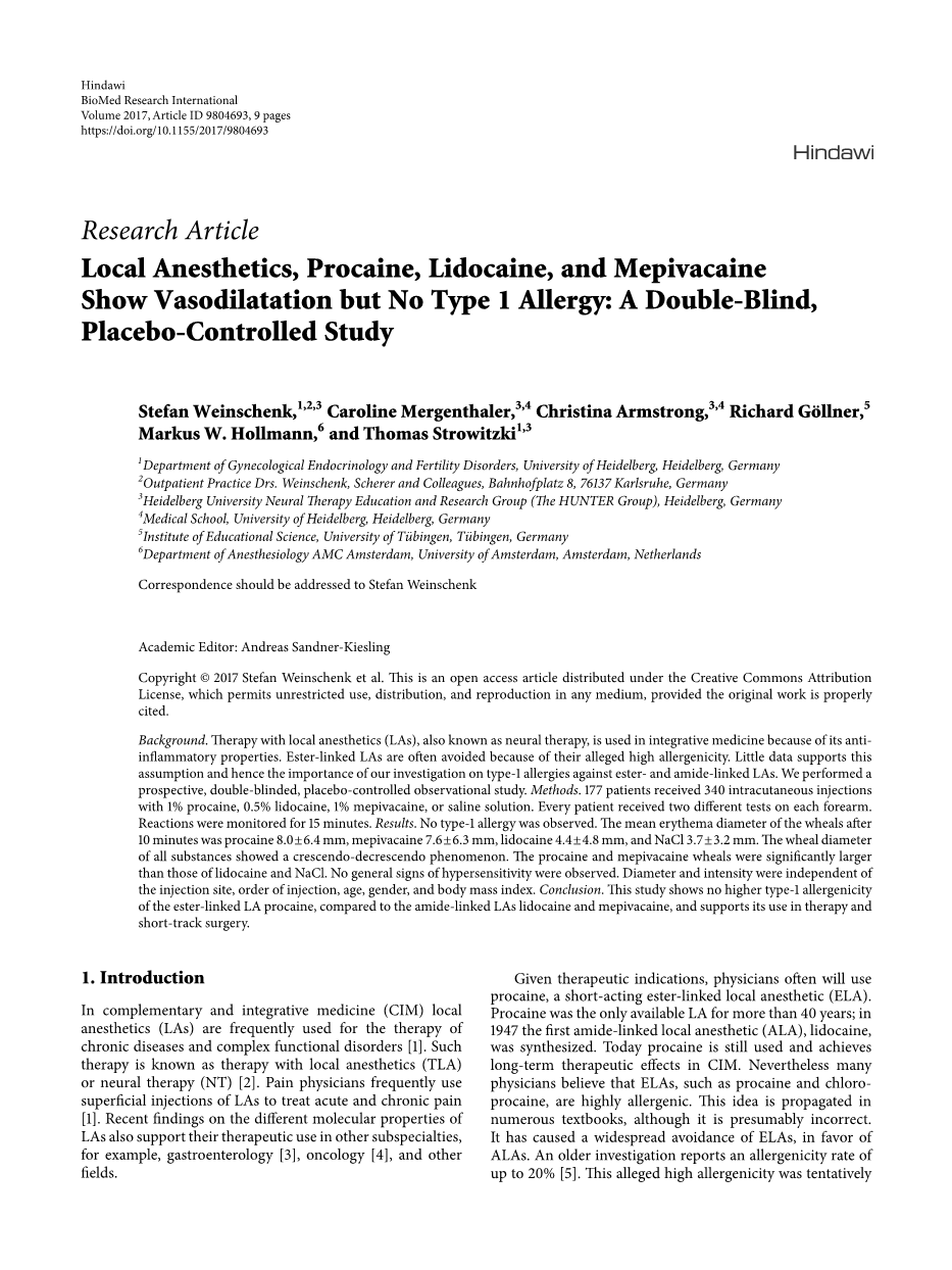 局部麻醉,普鲁卡因,利多卡因和美哌卡因显示血管扩张,但没有1型过敏:一项双混合,安慰剂对照研究。