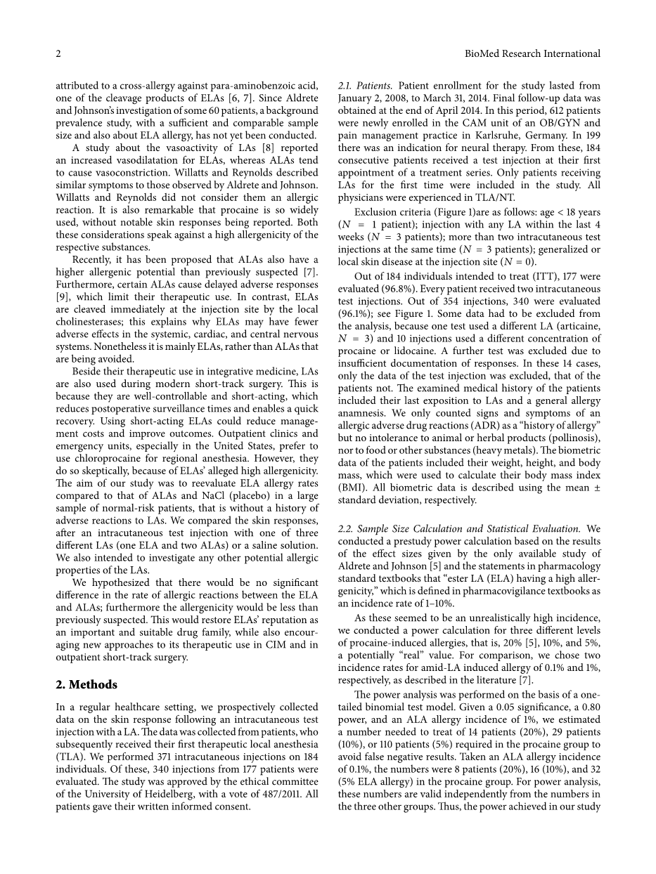 在常规医疗机构中,我们前瞻性地收集了使用LA进行皮内注射后皮肤反应的数据,并从患者中收集了Te数据,这些患者随后接受了首次治疗性局部麻醉(TLA)。 我们对184个人进行了371次皮内注射。 其中,对来自177位患者的340次注射进行了评估。 该研究获得海德堡大学伦理委员会的批准,票数为487/2011。所有患者均签署了知情同意书。